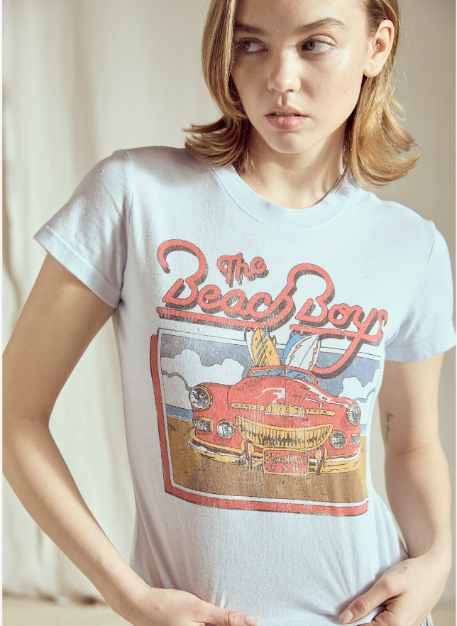 Celebrate your love for classic tunes with the People of Leisure Beach Boys Baby Tee. This graphic band tee features a soft, short-sleeve design in a refreshing light capri blue, perfect for warm days. Its lightweight fabric ensures all-day comfort, making it an effortless addition to your casual wardrobe. Embrace nostalgic style while staying cool and relaxed wherever you go.