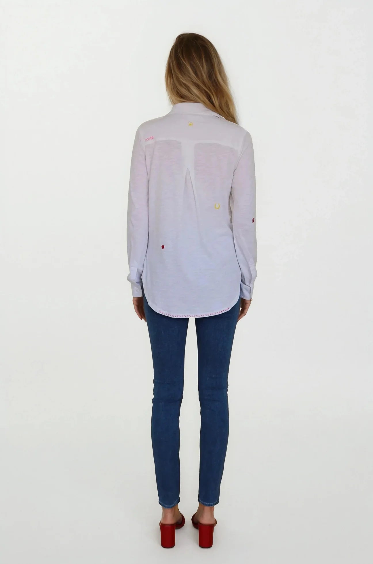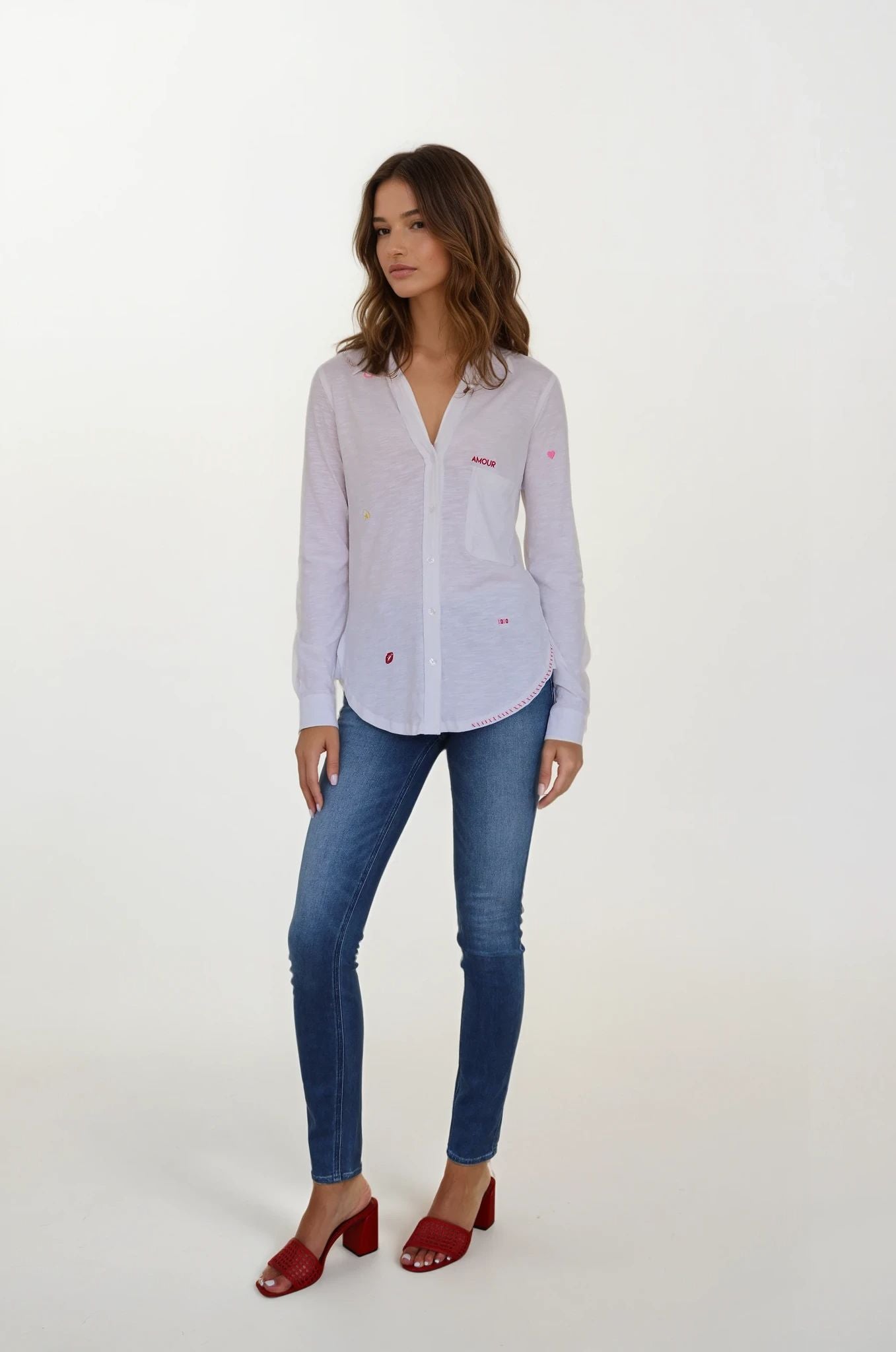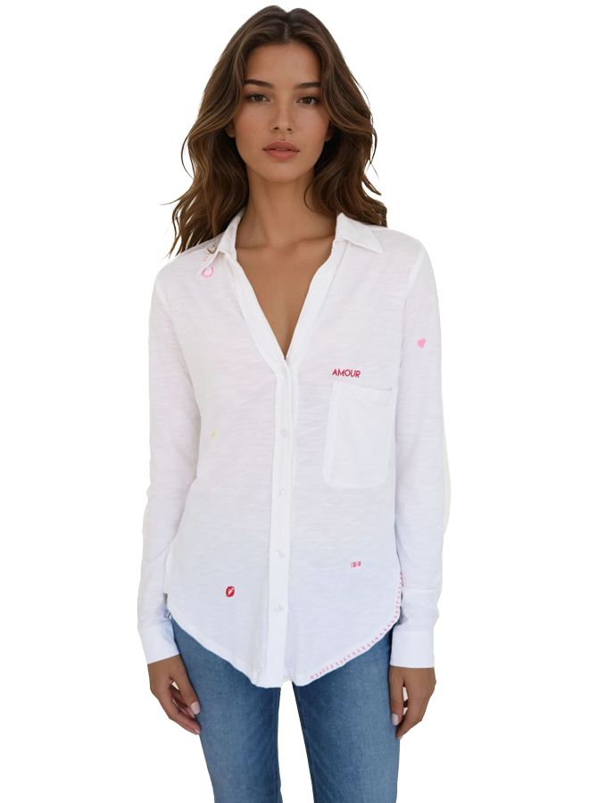 The Embroidered Amrat Blouse from CHRLDR reimagines the classic button-down with irreverent charm. Crafted from soft, breathable slub jersey that feels naturally broken-in, this piece delivers polished sophistication without the stuffiness. Delicate embroidered motifs—hearts, "love," "amour," and "kiss"—scatter across the fabric like intimate love notes, adding personality and playfulness to an everyday essential. Perfect for women who refuse to choose between comfort and style, it's the kind of blouse that works as hard as you do while keeping things fun and unapologetically you.