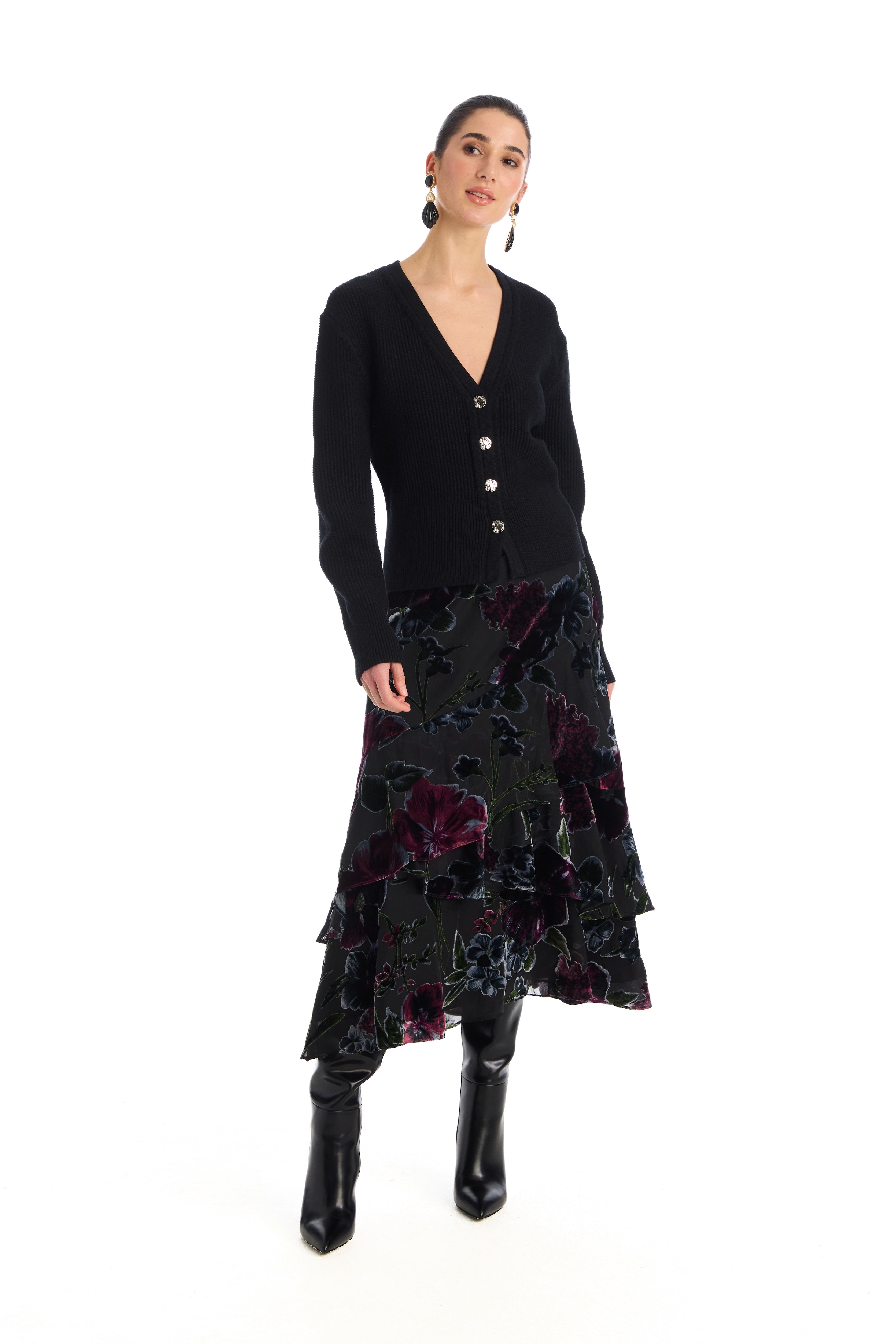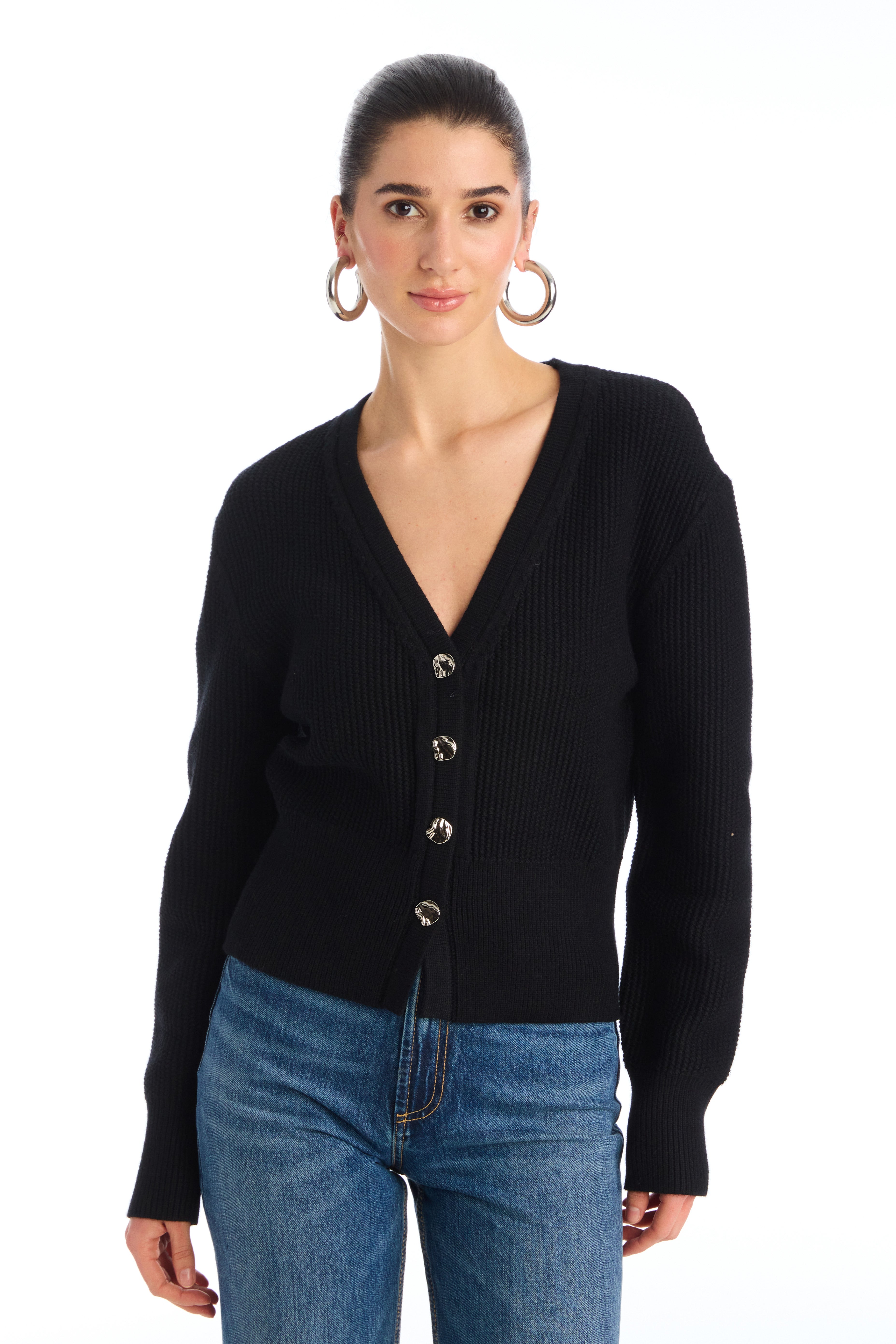 The Allison NY Fallon Cardigan invites you to embrace comfort and style effortlessly. Crafted from soft viscose yarns, its shiny silver snap front and flirty V neckline add a touch of sparkle and charm to any outfit. Perfectly designed for layering, this cardigan turns every day into an opportunity to feel fabulous and confidently cozy.