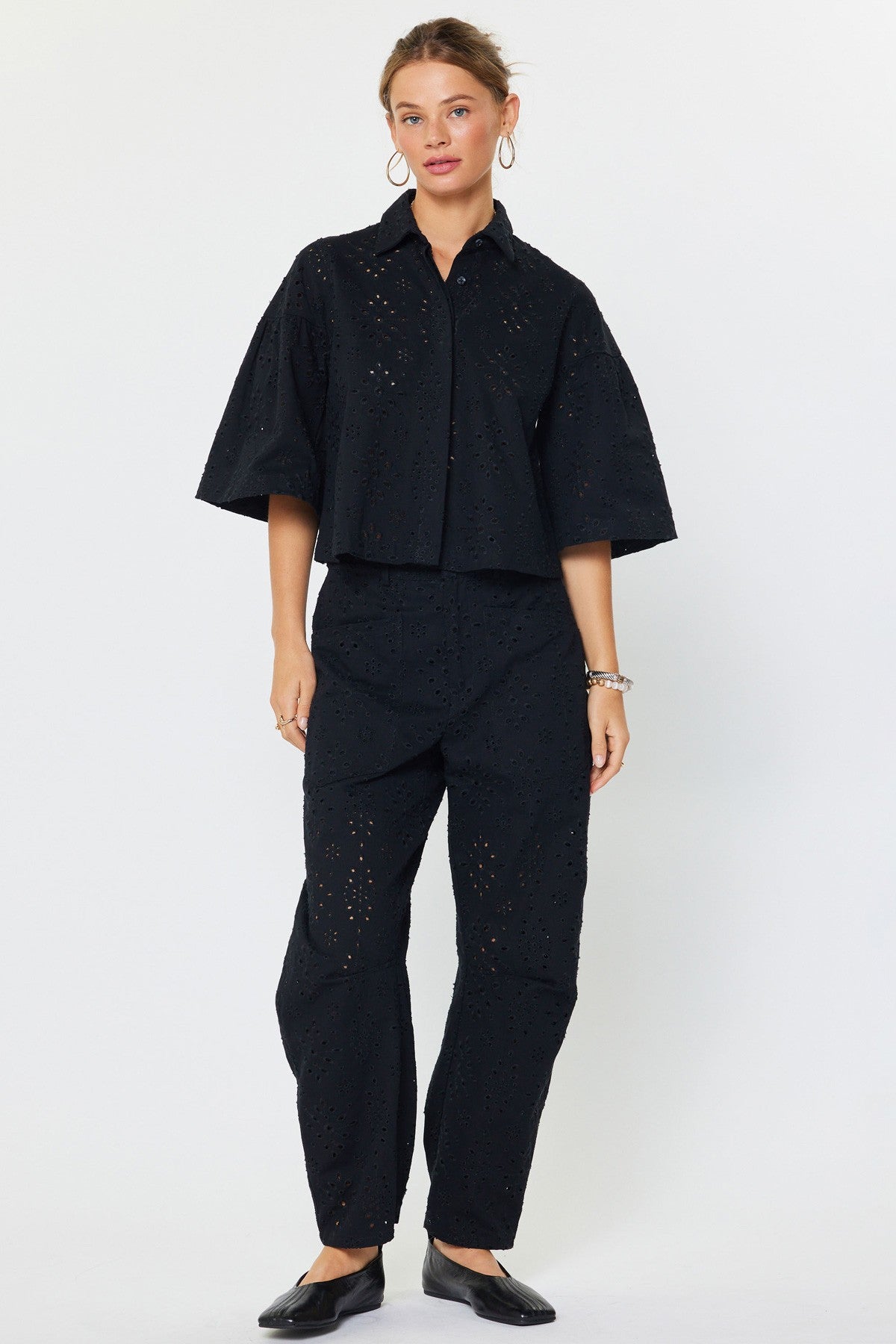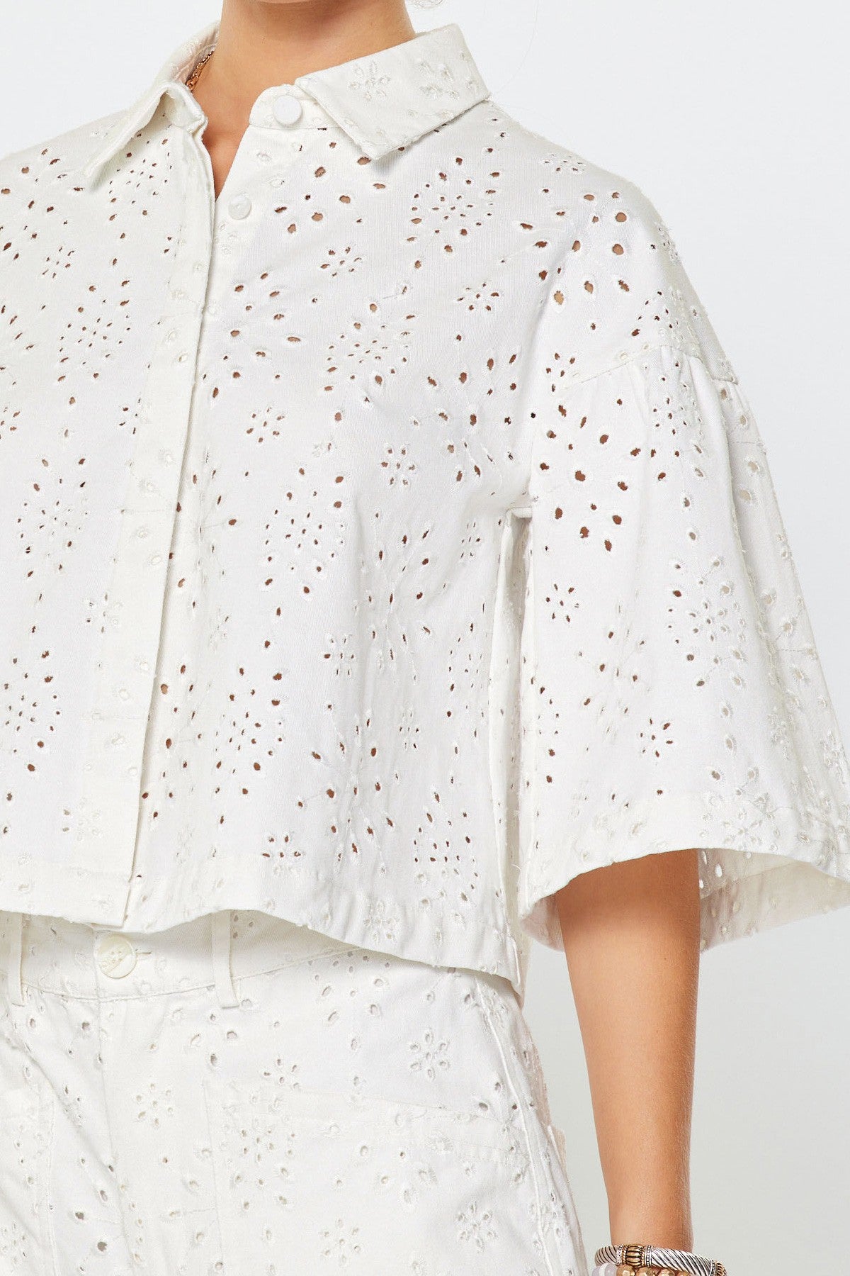 Effortless elegance meets everyday comfort in the Madison Eyelet Embroidered Cropped Shirt. Crafted from breathable cotton, this piece features delicate eyelet embroidery that adds refined texture and visual interest. The cropped boxy silhouette pairs perfectly with high-waisted bottoms, while short wide sleeves and a classic collar create a polished, versatile look. Button-down closure allows for easy layering and styling flexibility. Whether dressed up for brunch or down for casual weekends, this oversized relaxed-fit essential transitions seamlessly across your wardrobe.