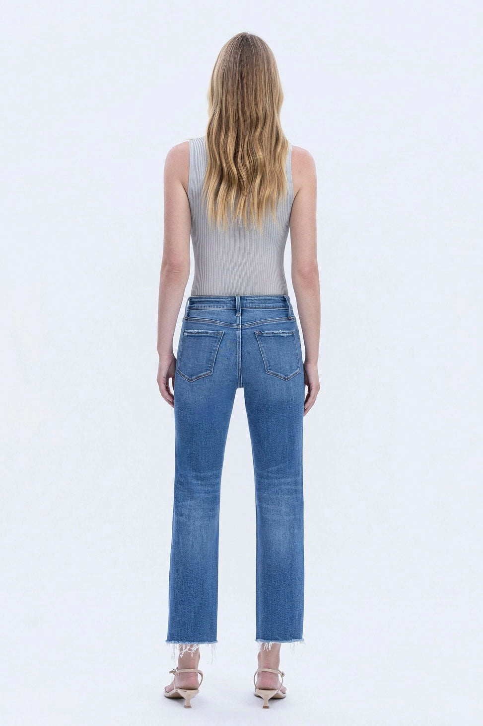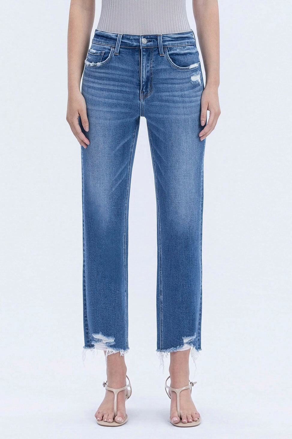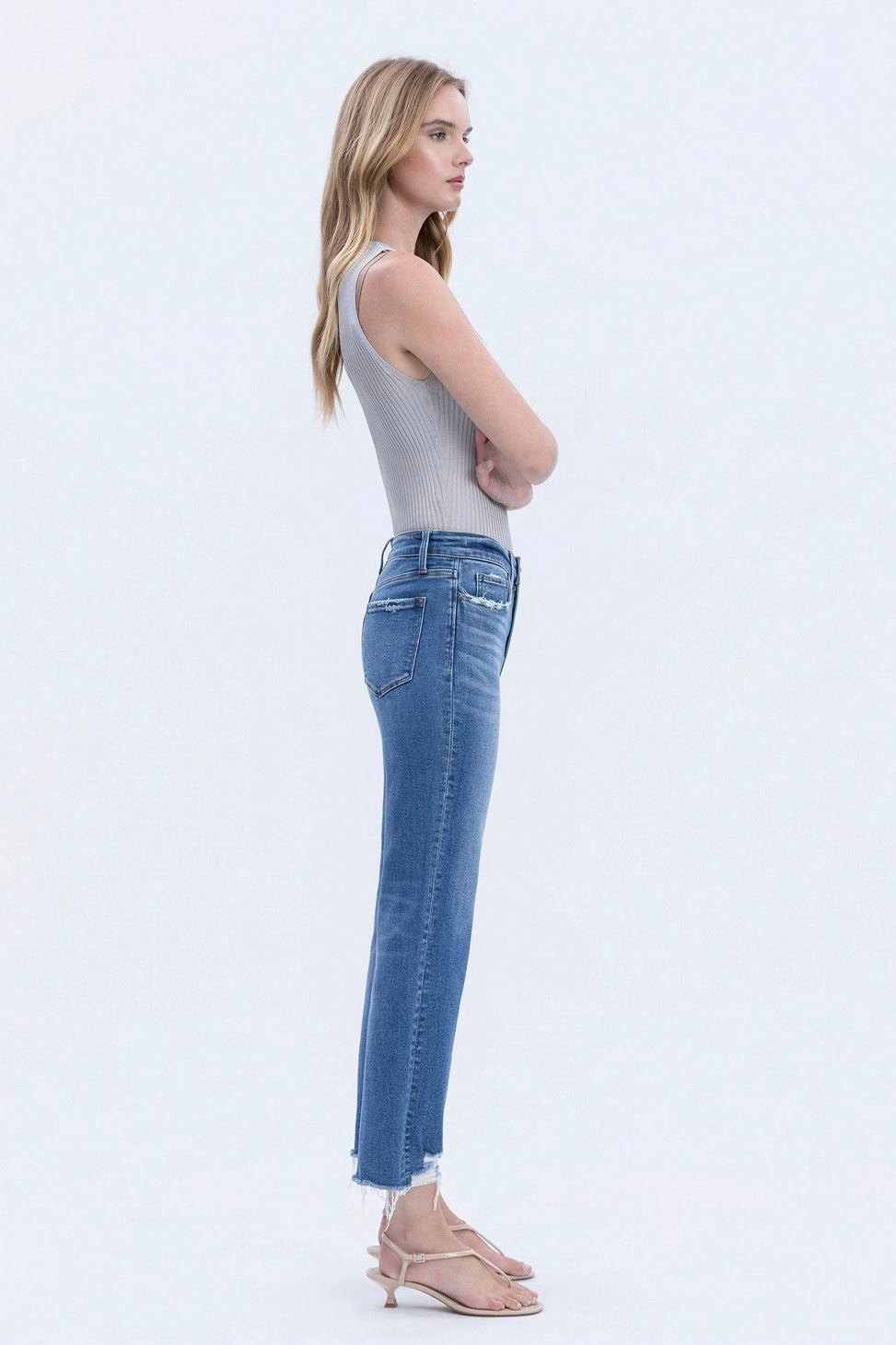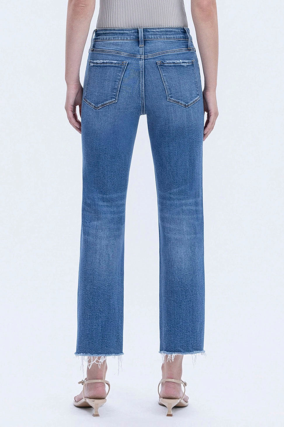 Experience effortless style with the Vervet Lovervet Cropped Straight Leg Jeans. Crafted from comfort stretch denim, these jeans provide a flattering high-rise fit that shapes your waist. Distressed details and a frayed hem add a trendy, lived-in vibe, while the cropped length and straight leg silhouette make them perfect for showcasing your favorite footwear. Elevate your everyday look with these versatile, on-trend jeans designed for both comfort and confidence.