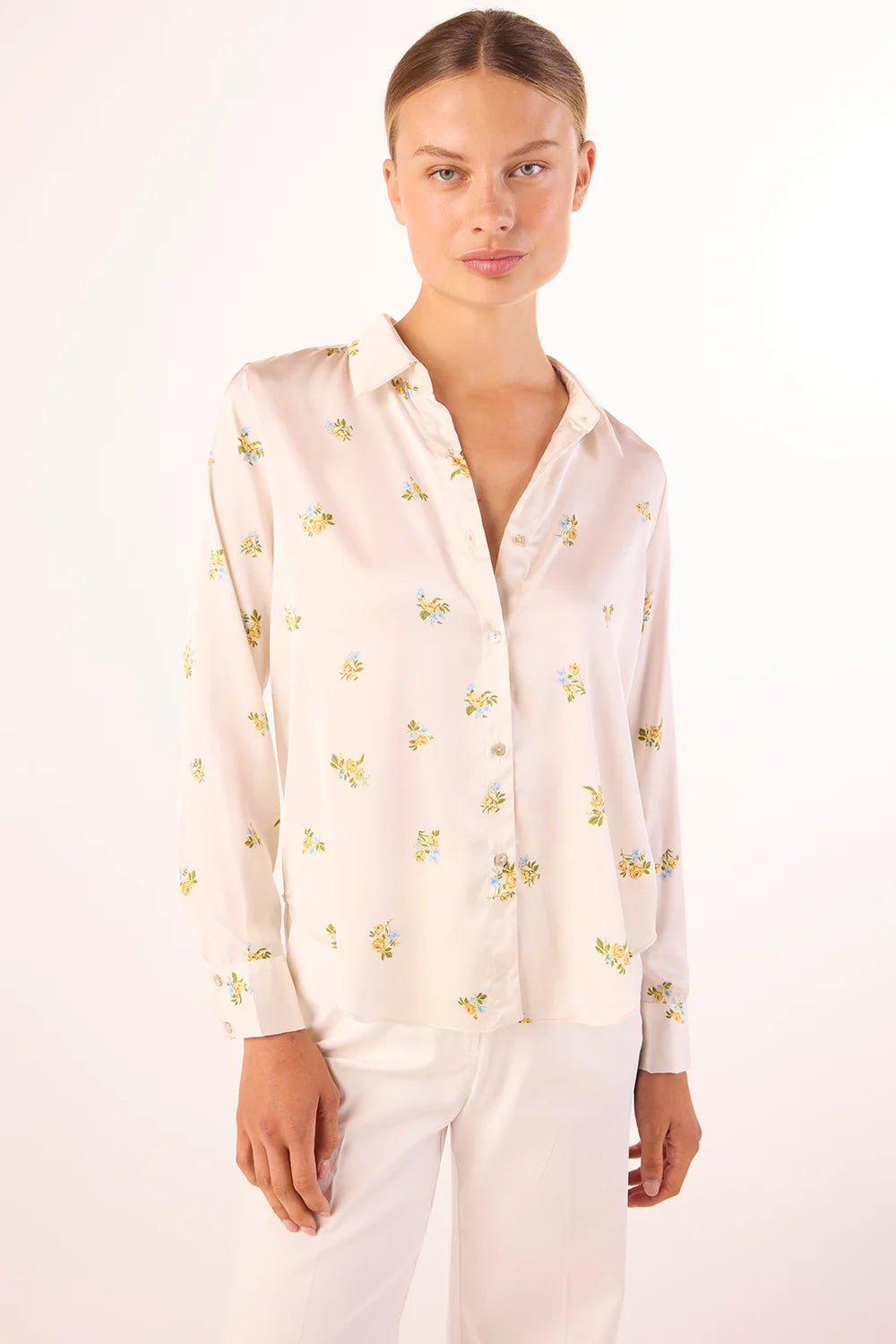Elevate your everyday wardrobe with the Misa Celine Top, crafted from luxurious ivory satin adorned with delicate yellow ditsy florals. This refined piece features a timeless fold-over collar and pearlized button closures that add understated sophistication. Versatile and polished, it transitions effortlessly from tailored trousers for