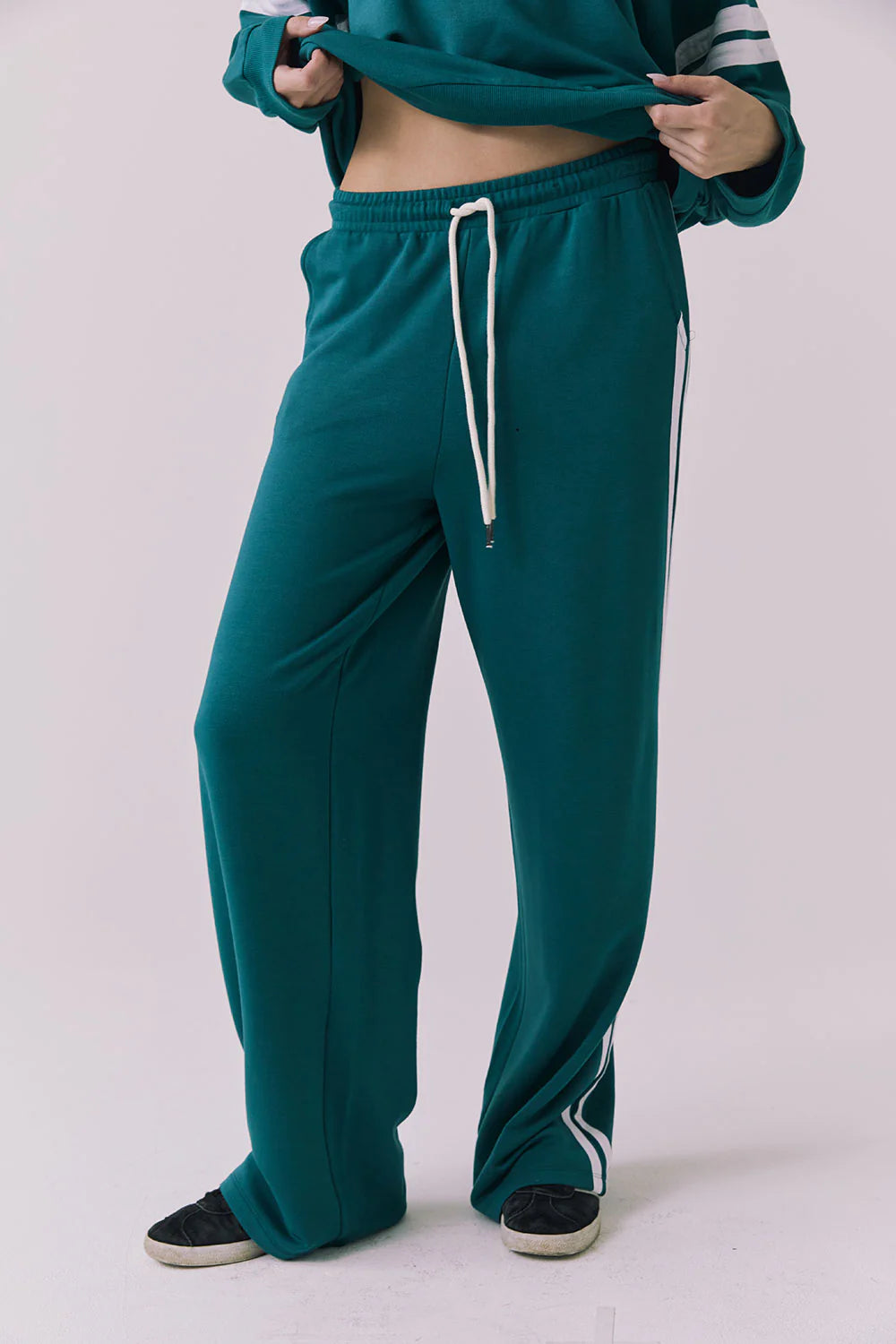The Sandi Joggers merge everyday comfort with polished design, featuring a tailored cut and tonal stripe accents along the seams. The neutral colorway works as a versatile foundation for layering and mixing with your existing pieces. Style with the Abilenee Zip Up Hoodie for an effortless, coordinated look that balances relaxed wear with intentional sophistication.
