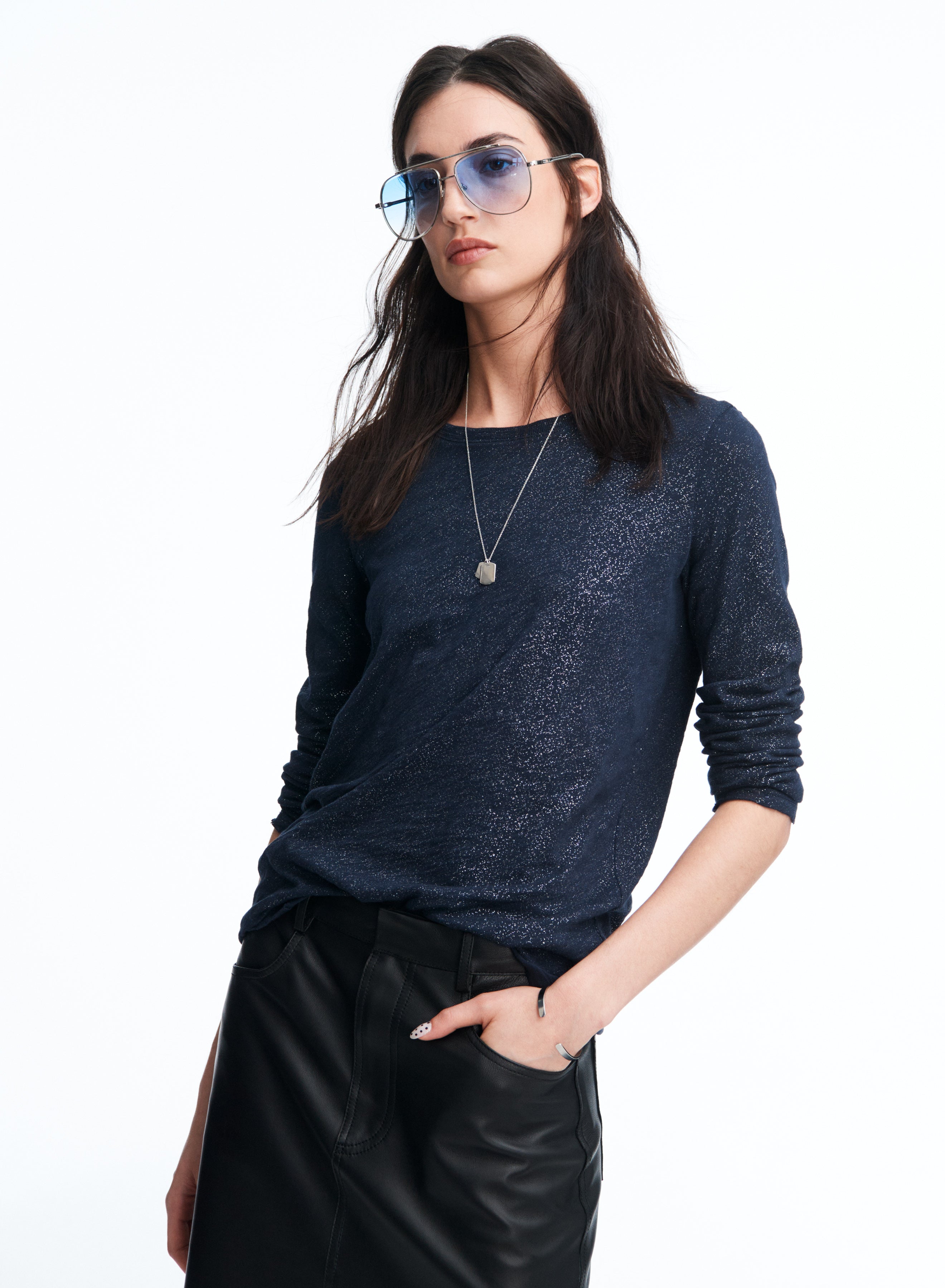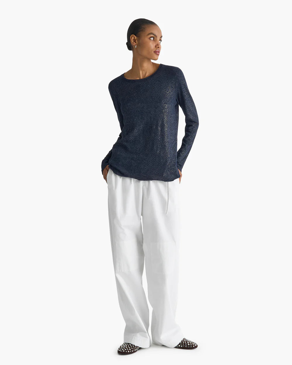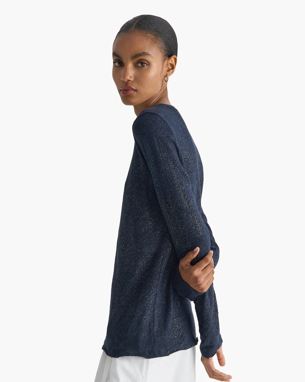 Crafted from premium Peruvian cotton, this Slub Jersey Long Sleeve Tee delivers distinctive texture through its signature uneven yarns. The scoop neckline pairs beautifully with imperfectly distressed hems and cuffs for an effortlessly cool aesthetic. Sheer in all the right places, the loose weave drapes gracefully against your body while maintaining a modest fit. Foil speckling adds an unexpected shimmer throughout, making this the perfect piece for layering or wearing solo. Comfortable, stylish, and undeniably unique.