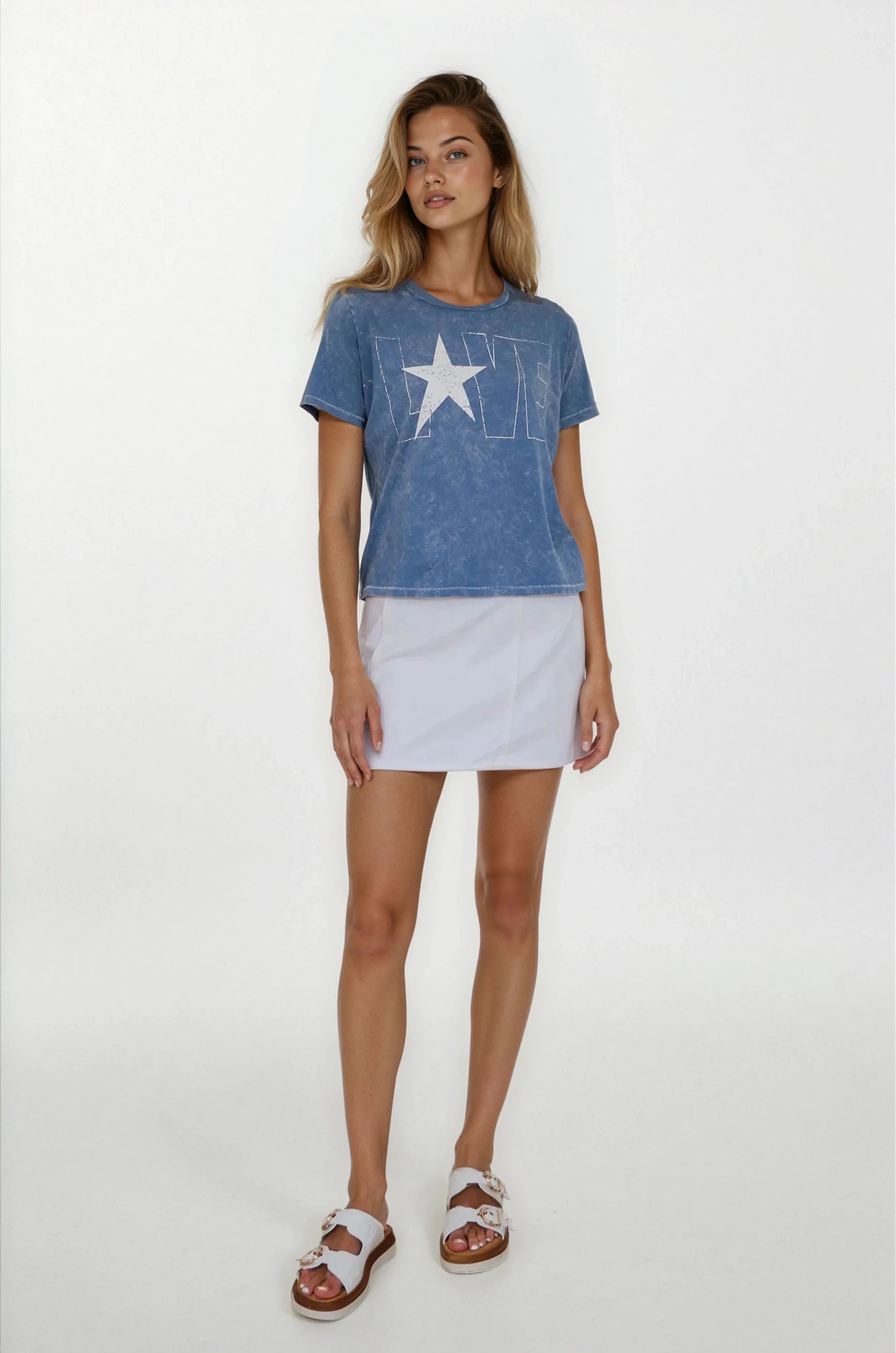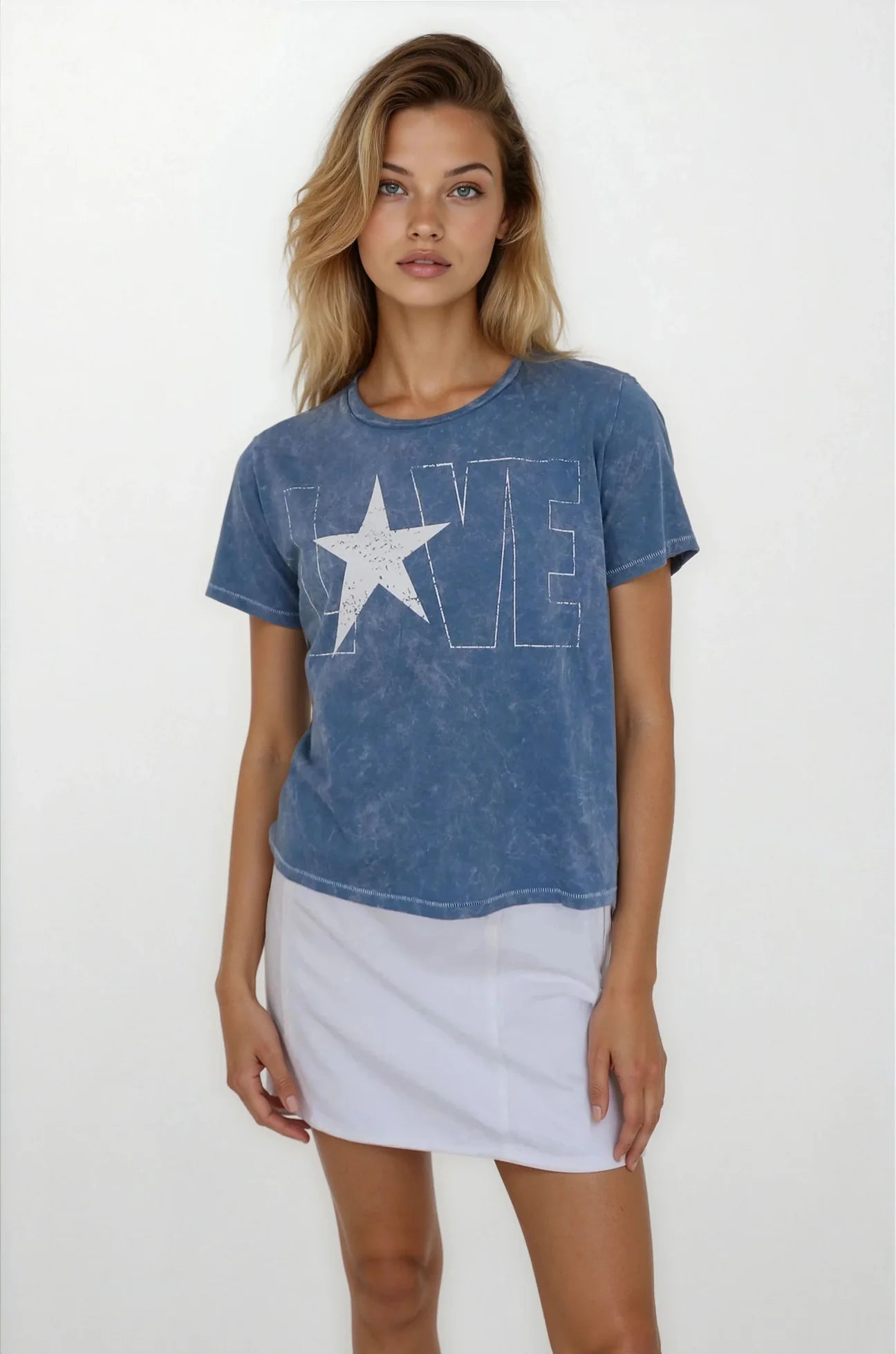 Effortless vintage charm meets modern edge in the Stellar Perfect Tee. Featuring a bold "LOVE" graphic and distressed star detail on the front, this medium blue washed tee delivers that coveted lived-in aesthetic from day one. The soft, breathable fabric makes it endlessly wearable—perfect for elevating any casual look without the effort. Whether styled solo or layered, this is the piece that transforms a simple outfit into something intentionally cool.
