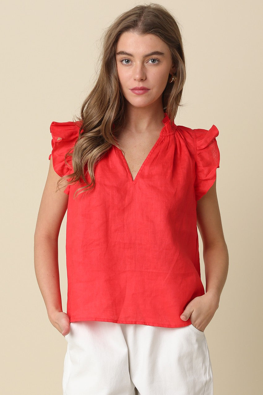 Elevate your everyday wardrobe with the Olivaceous Heidi Linen Ruffle Blouse—a timeless piece that effortlessly balances style and comfort. The signature ruffled sleeves add romantic dimension and movement, while the relaxed swing silhouette skims the body for a flattering, unbuttoned feel. Crafted from breathable linen, this blouse keeps you cool and composed from morning meetings to weekend outings. Perfect layered or worn solo, it's the versatile essential that transitions seamlessly across seasons and occasions.