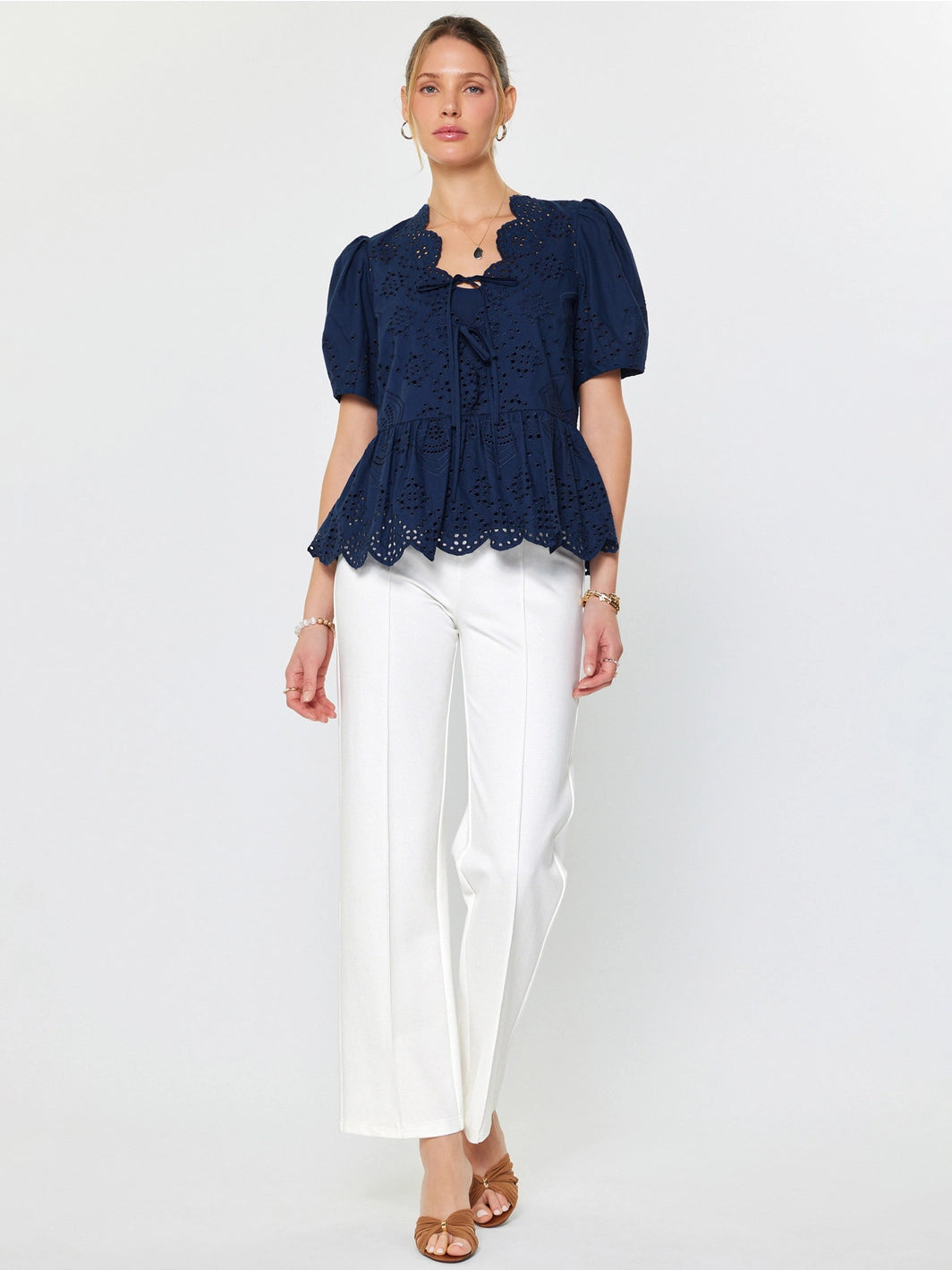 Effortless elegance meets playful femininity in this cotton eyelet blouse. Delicate embroidered details and scalloped edges frame the neckline, while the self-tie front closure offers adjustable styling. Puff short sleeves add a romantic touch, and the peplum silhouette with scalloped hem creates flattering movement and dimension. Built-in cami lining ensures comfort and coverage. Perfect for warm-weather dressing, from brunch to evening occasions.