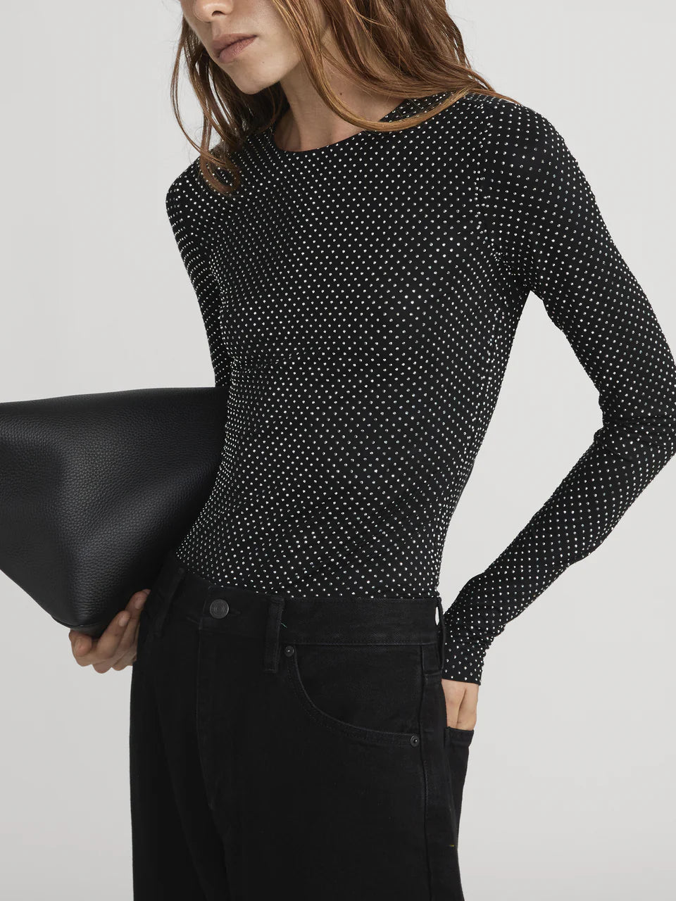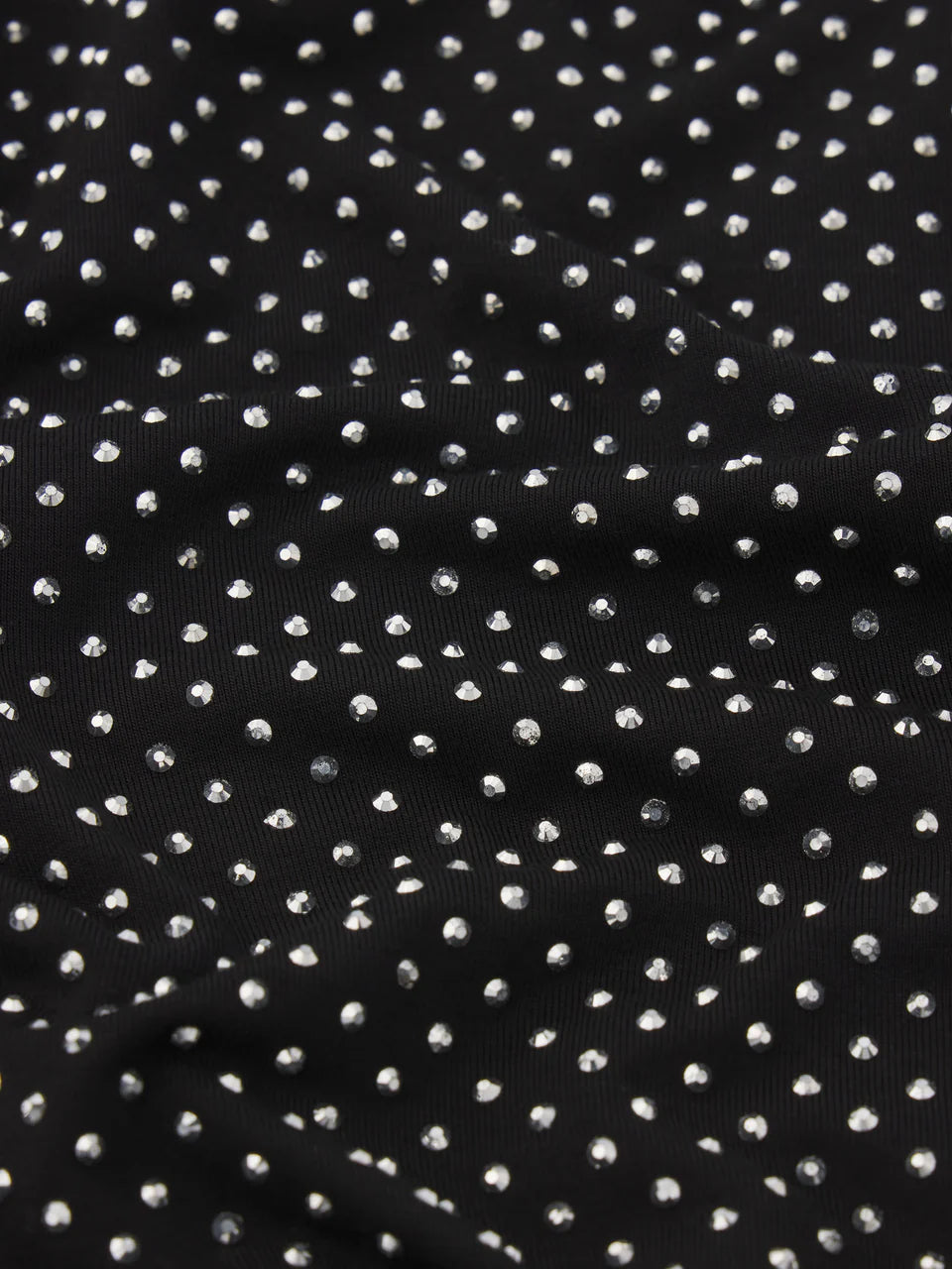 Prepare to turn heads in this stunning Frame Rhinestone Jersey Top. This form-fitting black top showcases mesmerizing micro rhinestone detailing across the entire surface, creating a captivating effect reminiscent of a starlit night. Crafted from luxuriously soft jersey knit, it offers effortless comfort without compromising on style. The sleek back seam adds a touch of sophistication, while the convenient zip closure ensures a polished finish. Perfect for elevating your evening look or adding glamorous flair to any occasion.