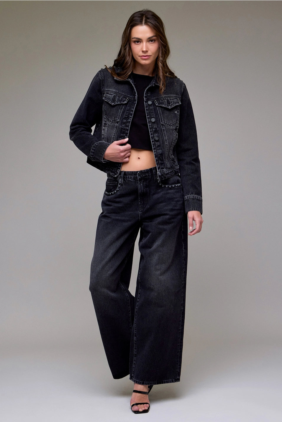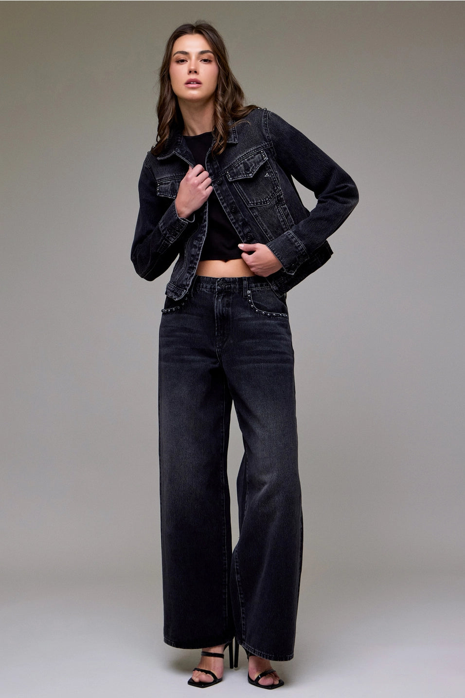 Elevate your style with the Hidden Charcoal Studded Trucker Jacket. Crafted from durable denim in a sleek charcoal shade, this jacket features subtle studded accents that add a touch of edgy sophistication. Its fitted cut ensures a flattering silhouette, perfect for layering over your favorite outfits. Whether heading out for a casual day or a night on the town, this jacket combines comfort and bold design to keep you looking effortlessly cool. Make a statement with this versatile wardrobe essential.