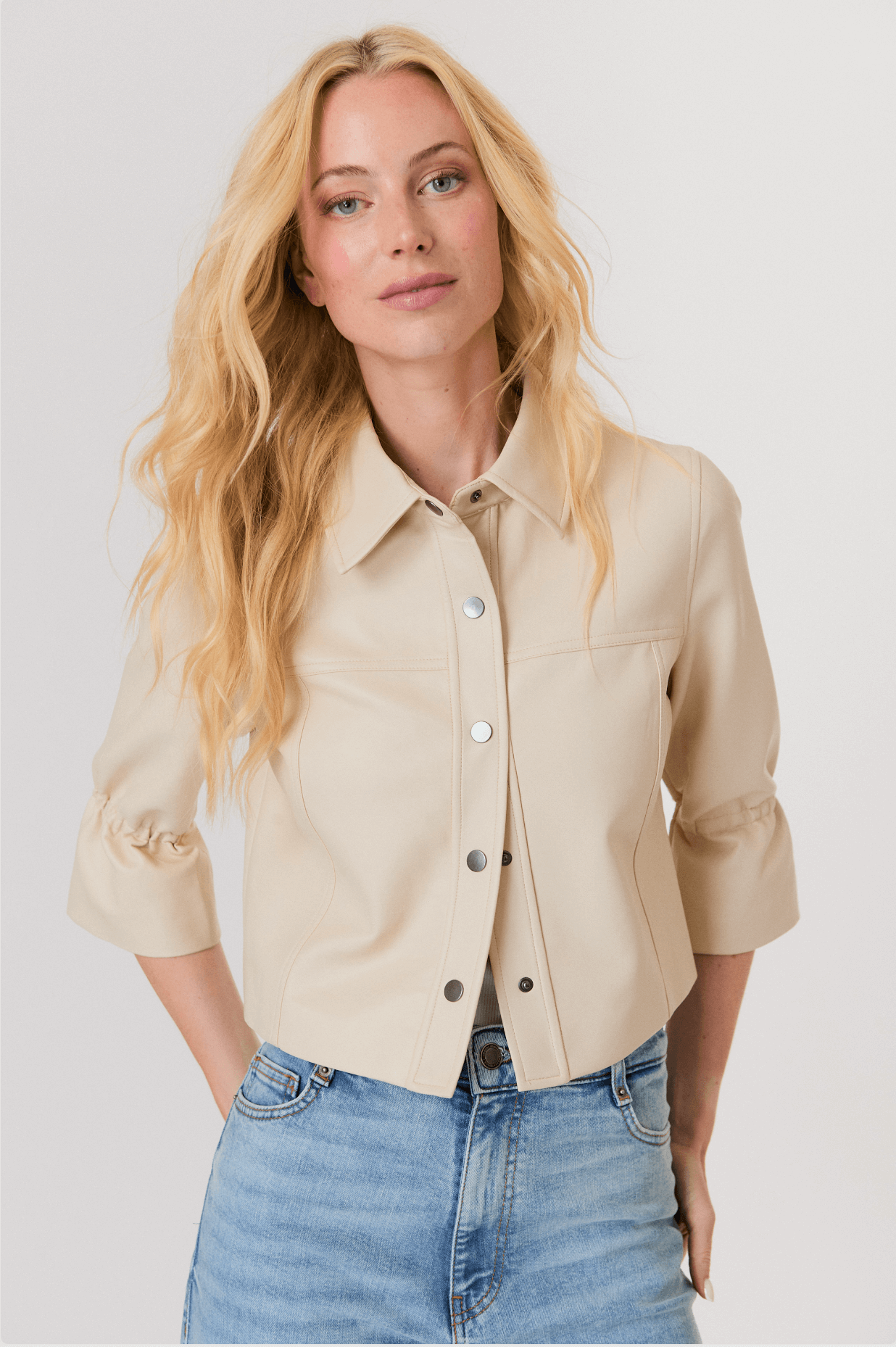 J Society Flare Sleeve Vegan Leather Jacket Sleek sophistication meets modern flair in this vegan leather jacket that transforms everyday styling. The luxe leather-like finish and structured collar deliver polished appeal, while statement flare sleeves add a distinctly feminine edge. Snap-button front closure and cropped silhouette create a sharp, tailored look that works equally well dressed up or down. Layer it over a tee and jeans for effortless daytime style, or pair with high-waisted trousers and heels for an evening-ready ensemble. A versatile wardrobe essential that elevates any outfit with contemporary edge.