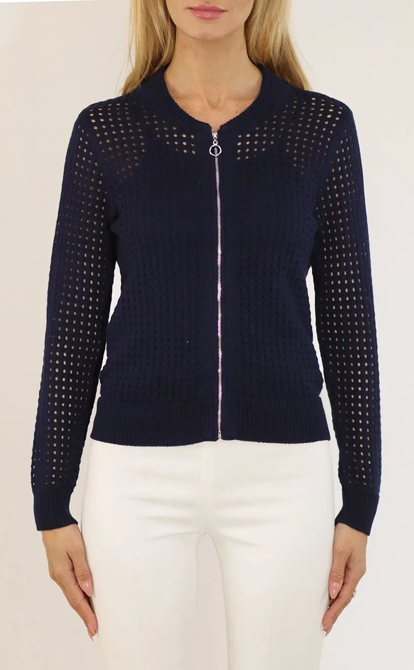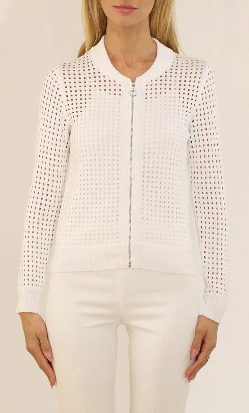 Elevate your layering game with this sophisticated Metric Pointelle Zip Front Jacket. Crafted from premium knit fabric featuring an intricate all-over pointelle stitch pattern, this piece delivers breathable texture with refined style. The crisp collar and full zip front offer versatile styling options—wear it as a standalone layer or throw it over your favorite tee. The clean white colorway pairs effortlessly with any wardrobe, making it a go-to essential for transitional seasons. Perfect for those who appreciate quality construction and timeless design.