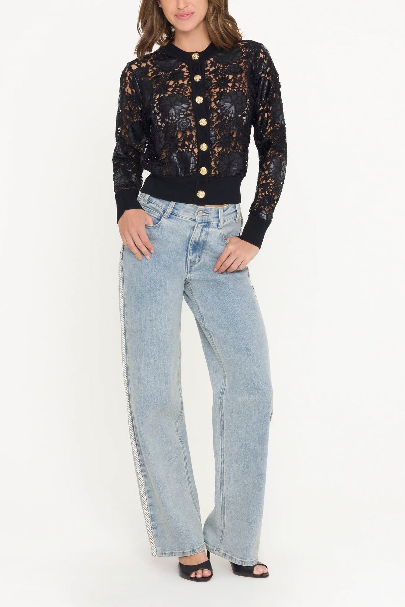 The Erin Vegan Leather Lace Cardigan merges sophistication with bold style, featuring intricate black lace enhanced by striking vegan leather accents. This button-front design pairs delicate femininity with contemporary edge, complete with polished gold hardware and refined ribbed trim. Layer it over camisoles, tailored trousers, or dresses for an effortlessly chic look that commands attention from morning meetings to evening outings. A transformative piece that elevates any wardrobe with undeniable versatility and attitude.