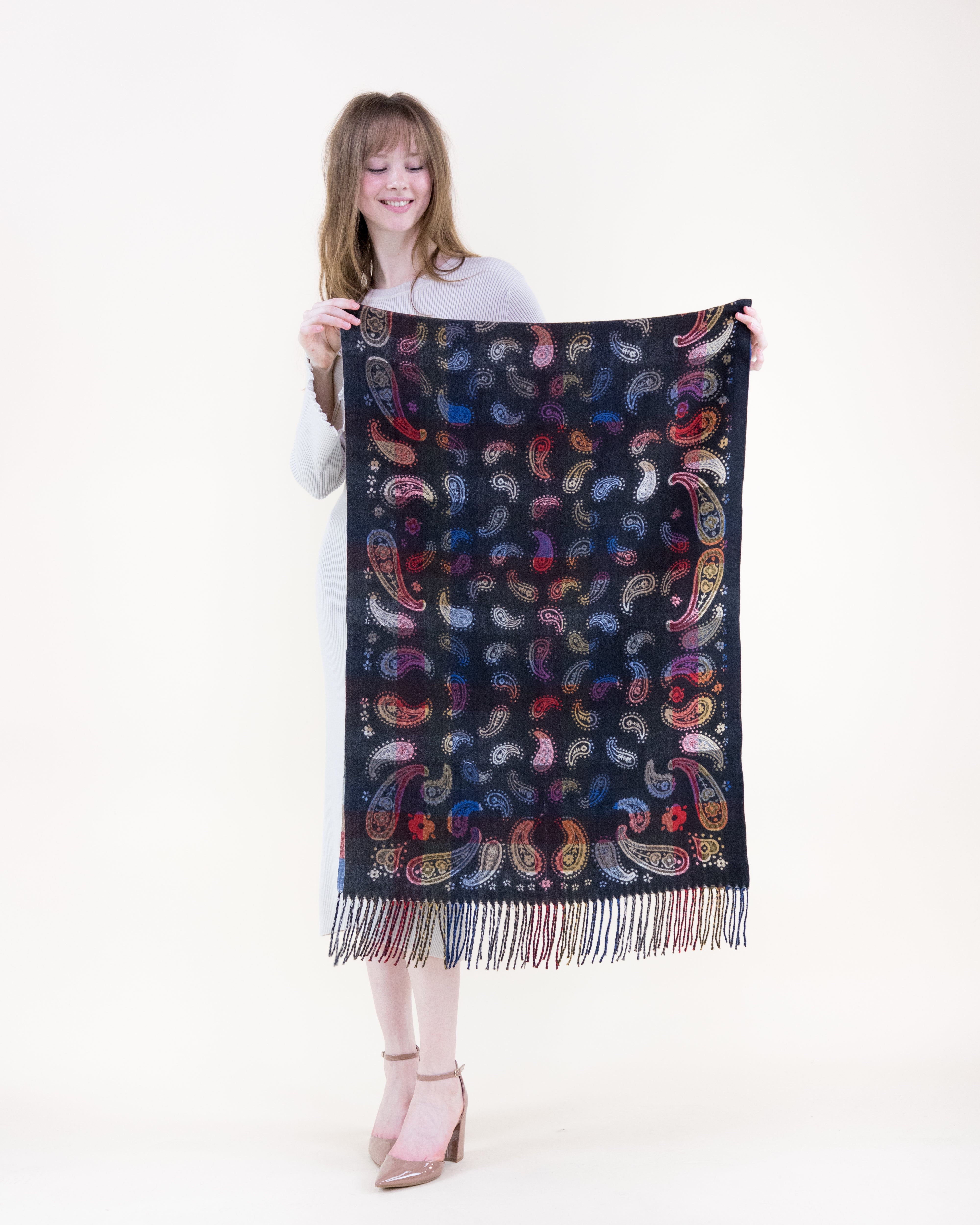 Add a vibrant touch to your outfit with the IScarf Paisley Print Scarf. Featuring a scattered multicolor paisley pattern on a sleek black background, this scarf effortlessly blends classic style with bold color. Its versatile design makes it perfect for dressing up any look, while the soft fabric ensures comfort throughout the day. Elevate your wardrobe with a statement piece that brings both elegance and energy to your ensemble.