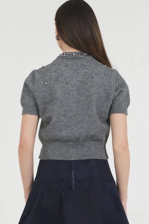 Elevate your wardrobe with the Stellah Jewel Neck Cardigan. Featuring delicate jewel embellishments along the neckline and top, this short sleeve cardigan adds a touch of sparkle to any outfit. Its button-front design offers easy layering and a polished look, perfect for both casual and dressier occasions. Comfortable and chic, this cardigan seamlessly combines style and versatility.