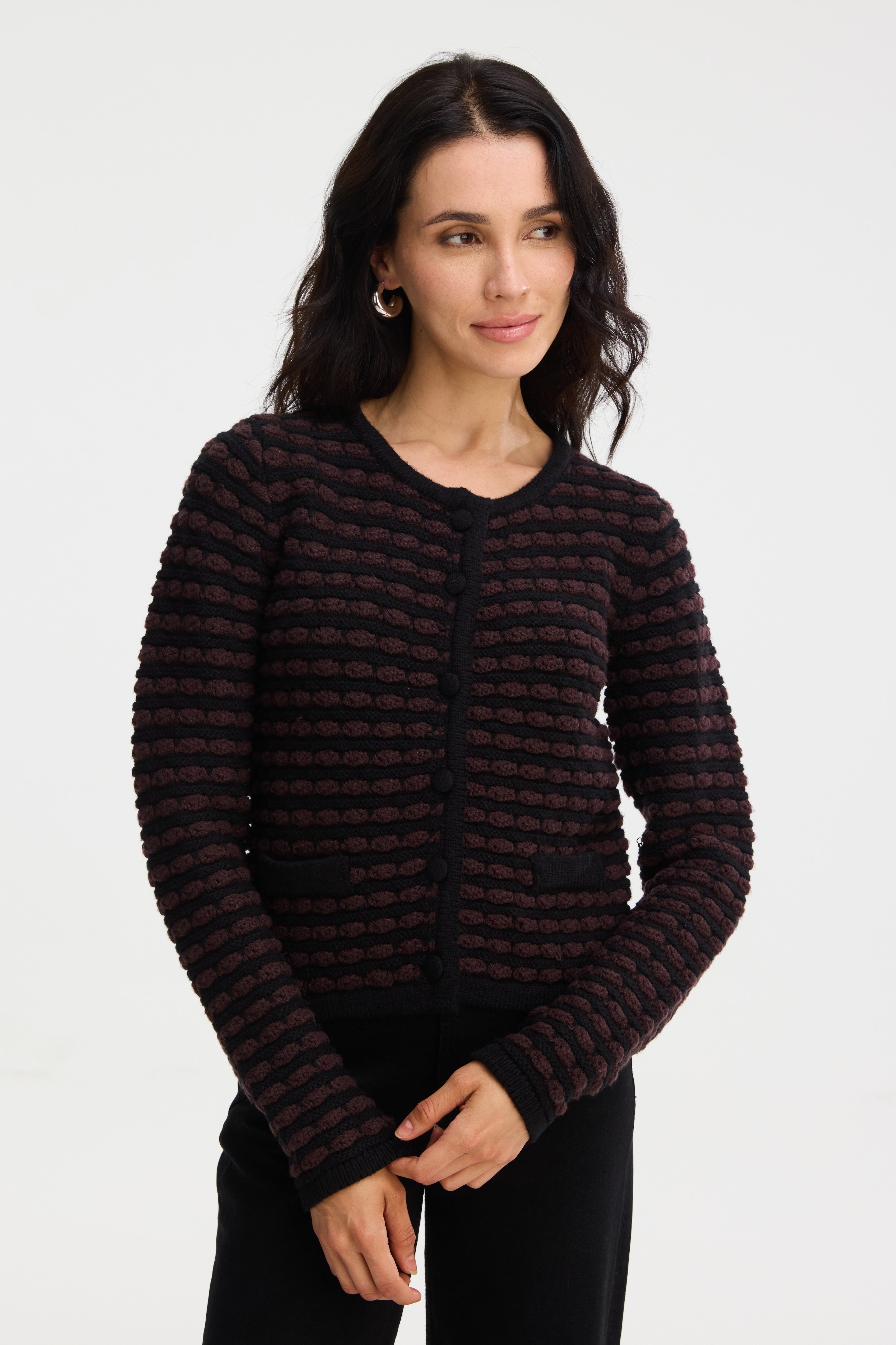 The Allison Maria Cardigan combines timeless elegance with modern comfort. This piece showcases our signature Adelle bubble knit in a sophisticated Black & Brown tonal palette, creating visual depth and texture. The refined neckline and classic covered buttons deliver a polished look perfect for layering or wearing solo. A gently fitted silhouette flatters your frame while faux welt pockets add both style and practicality. Versatile enough for the office or weekend wear, this cardigan is an essential addition to any wardrobe.