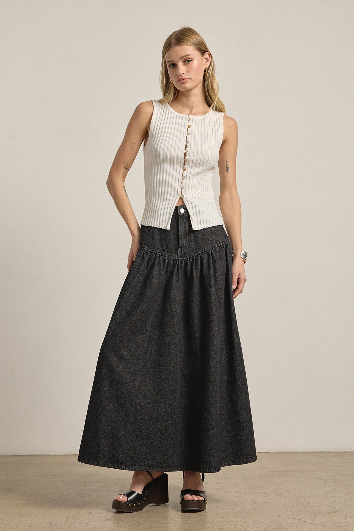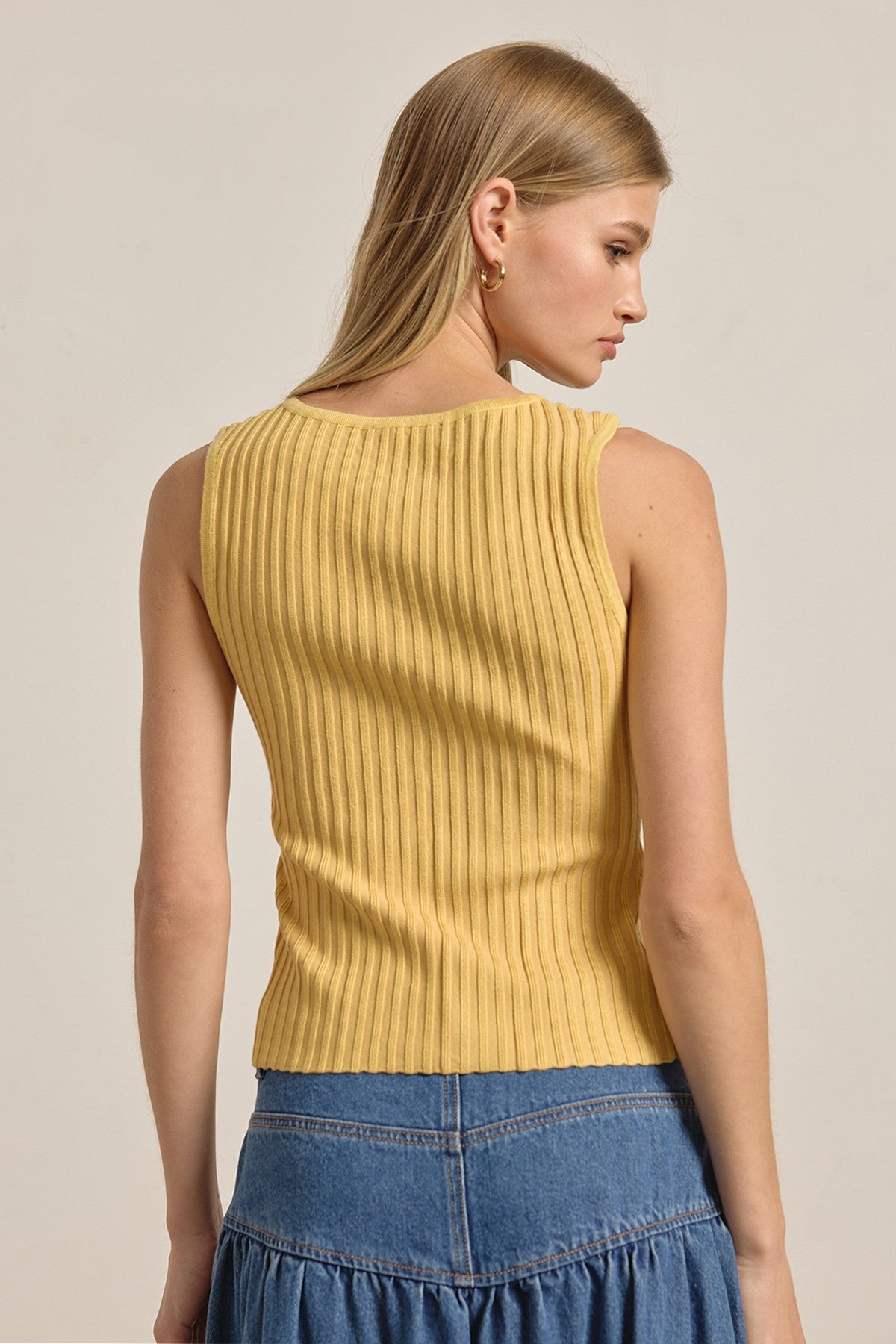 Elevate your everyday wardrobe with this sophisticated sleeveless button-front top. Crafted from soft viscose knit with a subtle ribbed texture, it hugs your frame in all the right places while maintaining breathable comfort. The scoop neckline and button-front closure add refined detail, making it equally stunning layered under a blazer or worn solo on warm days. Pair with tailored trousers, high-waisted denim, or a flowing skirt for endless styling possibilities. A versatile essential that transitions seamlessly from office to weekend.