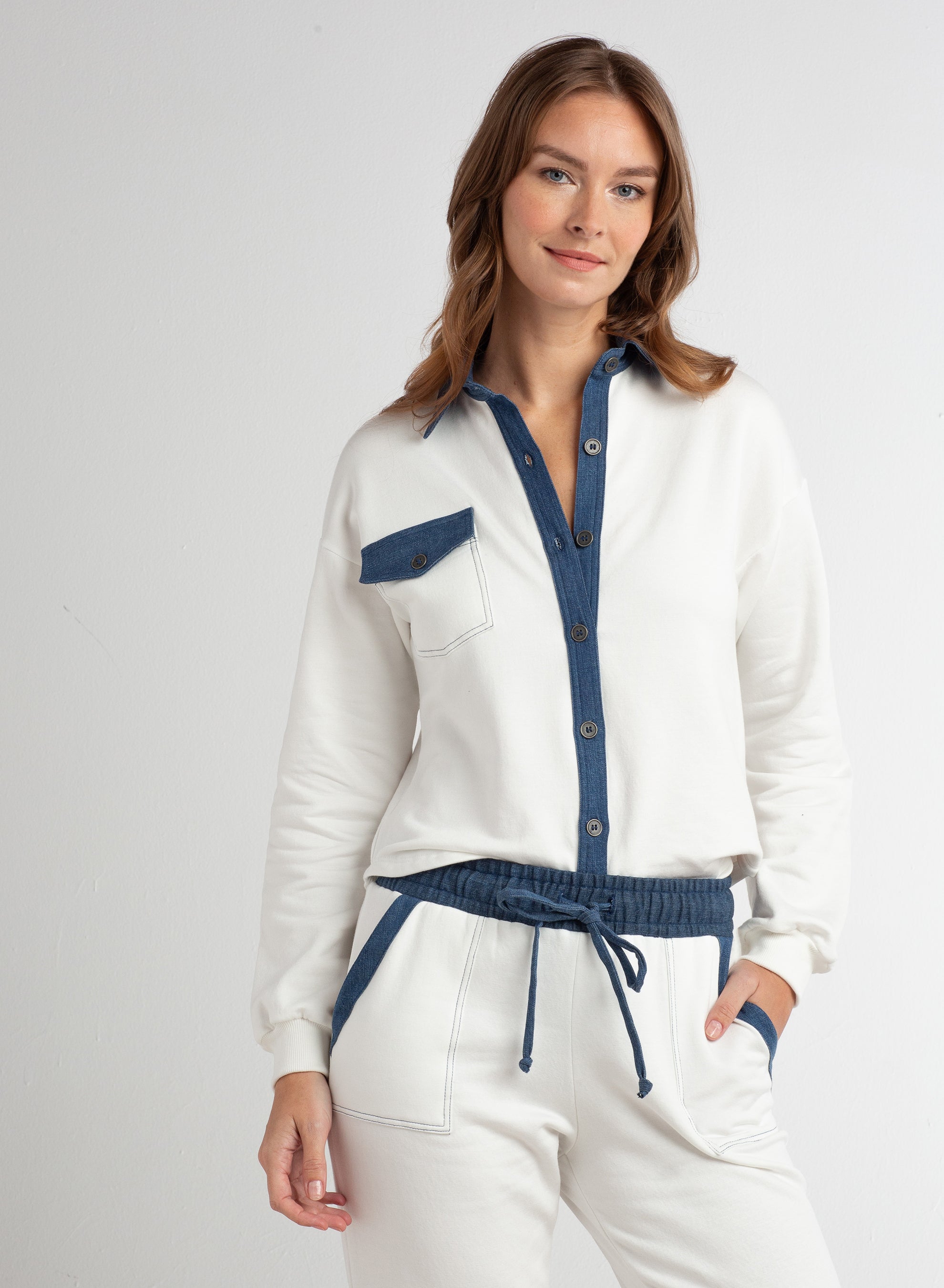 Effortless style meets comfort in this Red Haute boyfriend button-down shirt. Crafted from soft french terry with a structured denim collar, placket, and chest pocket, it delivers an elevated casual look that transitions seamlessly from weekend to work. The relaxed fit and quality construction make it a versatile wardrobe essential that pairs with everything from jeans to dresses. Perfect for layering or wearing solo, this piece combines texture and sophistication for an understated, polished appearance.