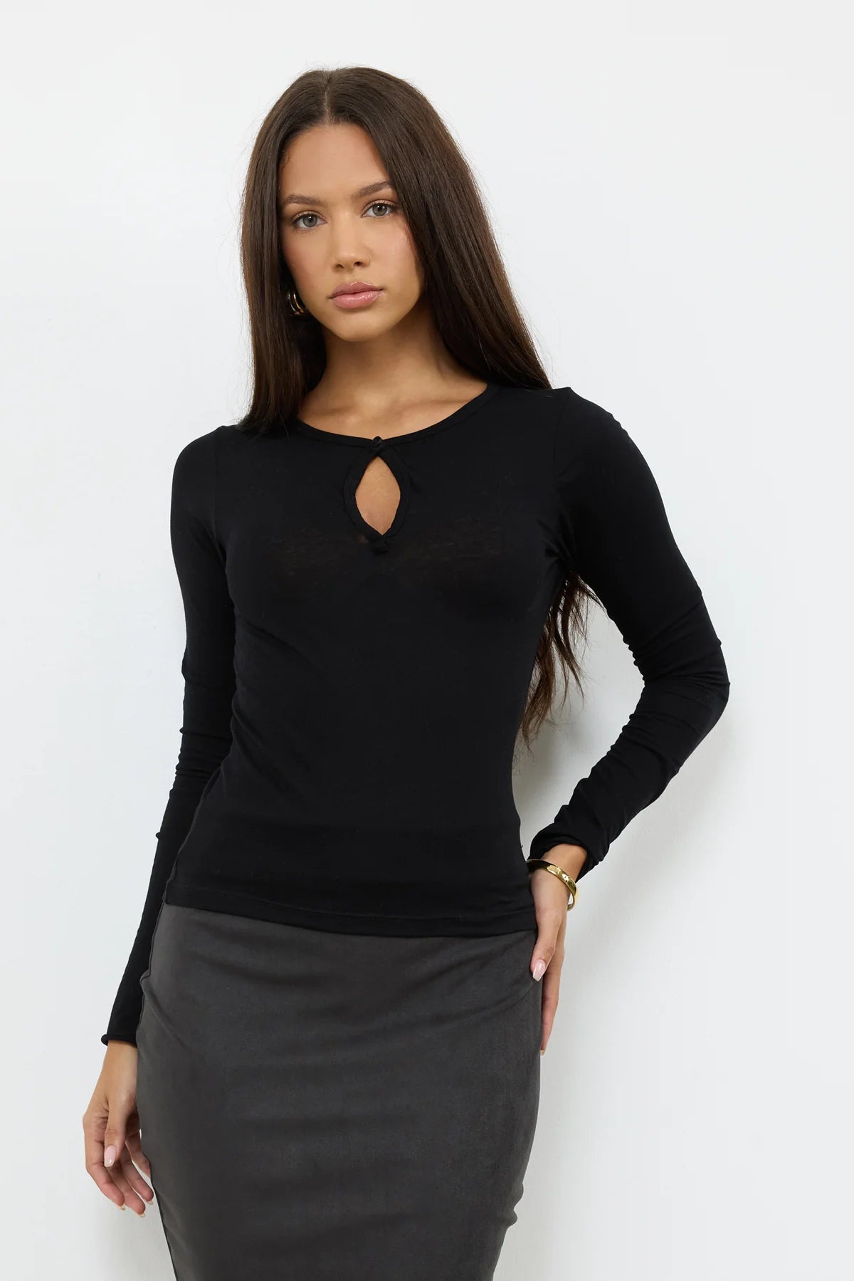 The LA Made Florian Long Sleeve Keyhole Tee delivers versatile style with an elegant twist. This essential stretch jersey features a flattering keyhole cutout and cinched neckline that adds feminine sophistication to your everyday wardrobe. Wear it buttoned for polished refinement or open for an effortlessly chic vibe—one piece, endless possibilities. Crafted from breathable stretch fabric with a luxuriously smooth hand feel, it moves with you throughout your day. The preshrunk construction ensures your fit stays perfect wash after wash. Pair it with denim for an instantly elevated look that works from season to season.