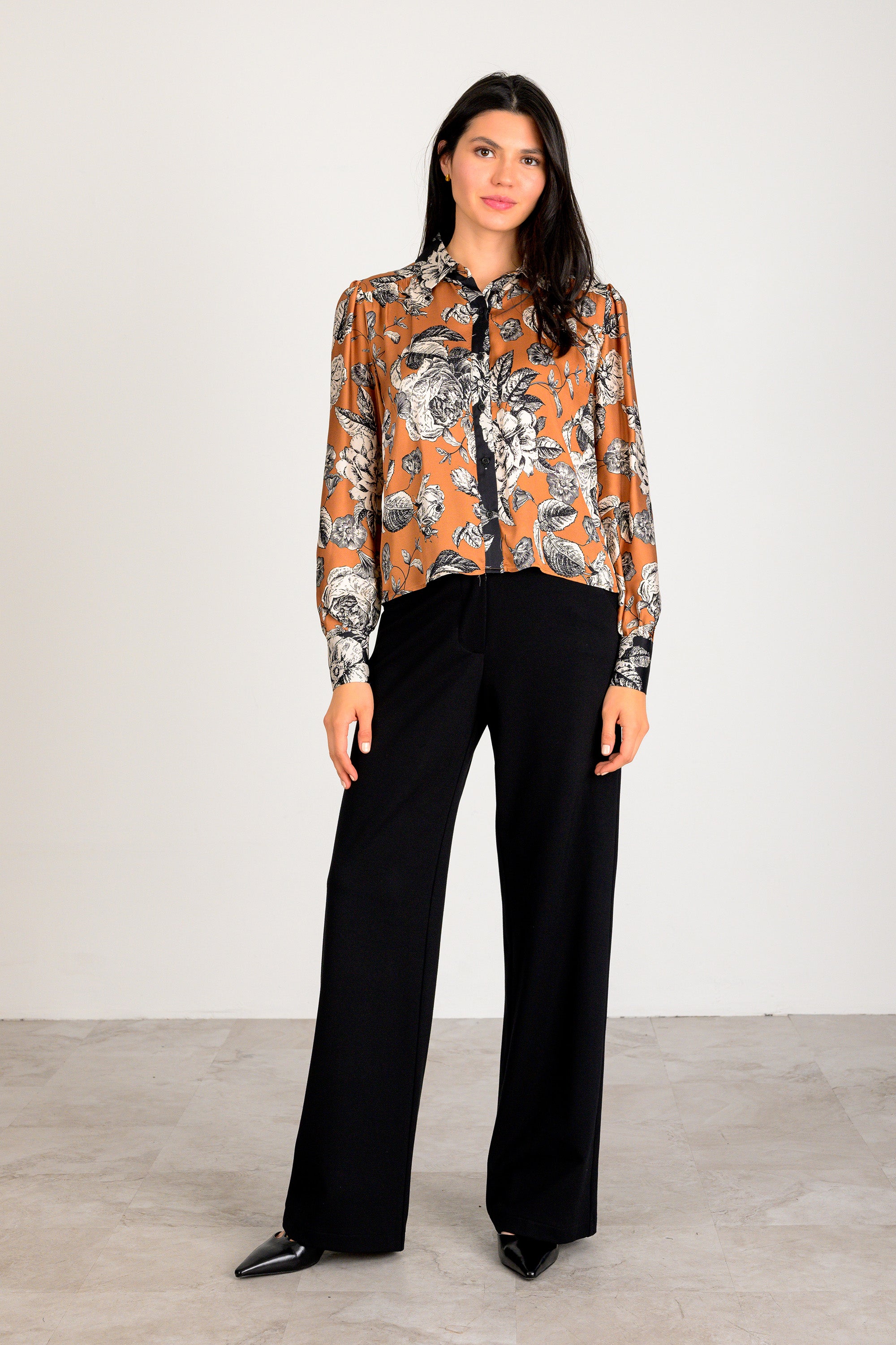 Add vibrant charm to your wardrobe with the Lavender Brown Paola Floral Top. Featuring a striking rust and black floral print, this long sleeve shirt combines a classic collar with a sleek button-down front. Perfect for work or weekend outings, it delivers effortless style and all-day comfort in one versatile piece. Elevate your look with this must-have top that balances modern design with timeless appeal.