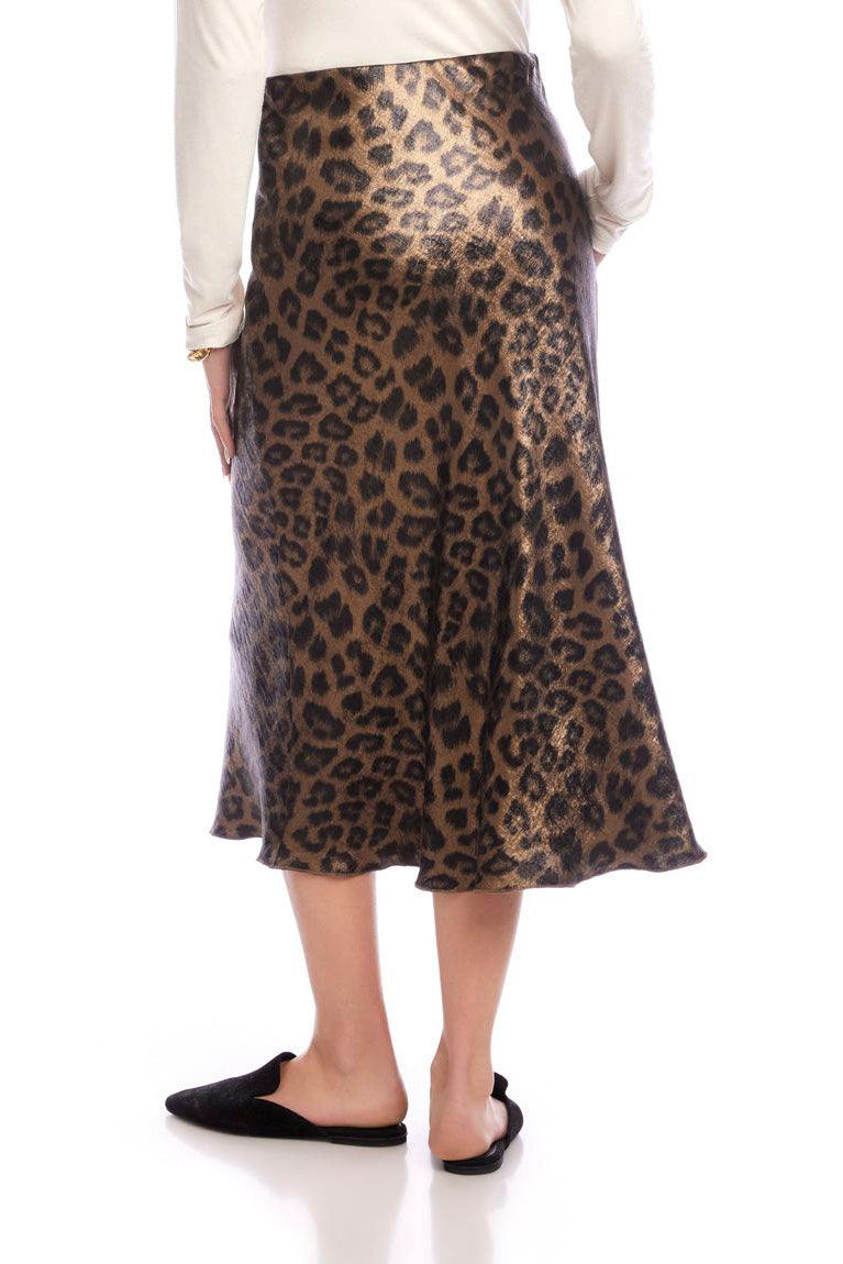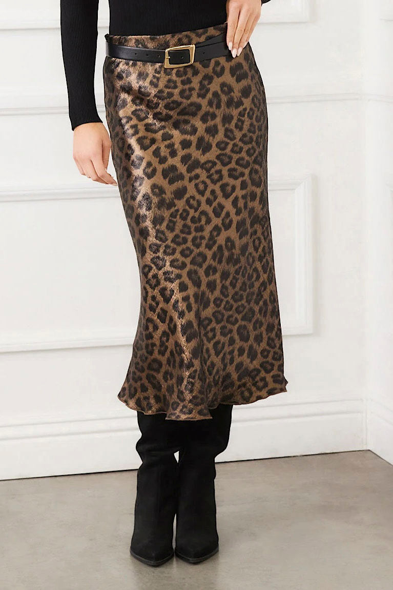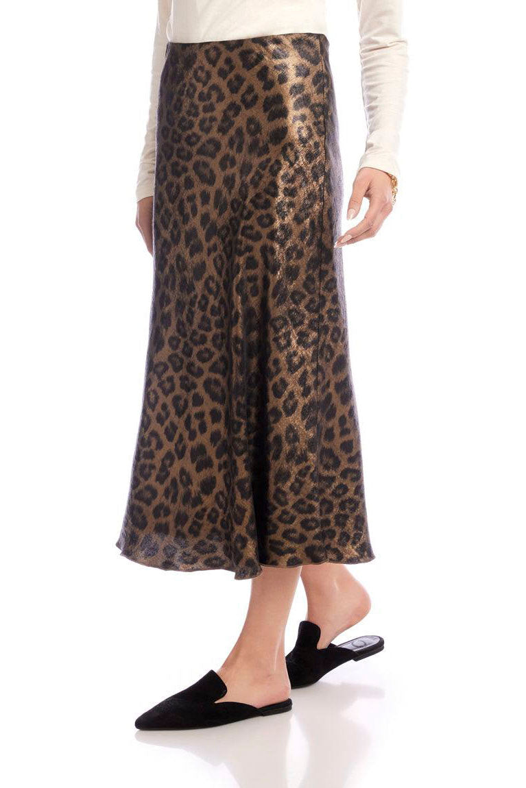 Elevate your wardrobe with the Karen Kane Leopard Skirt, designed in a shimmering animal woven print that catches the light with every step. Its bias-cut silhouette gently hugs the waist and flows effortlessly over the hips, creating a flattering and elegant shape. Fully lined for comfort and a smooth fit, this midi skirt combines sophistication with a touch of bold shine, making it the perfect statement piece for both day and night looks. Pair it with the Tie Front Leopard Print Blouse for an eye catching look!
