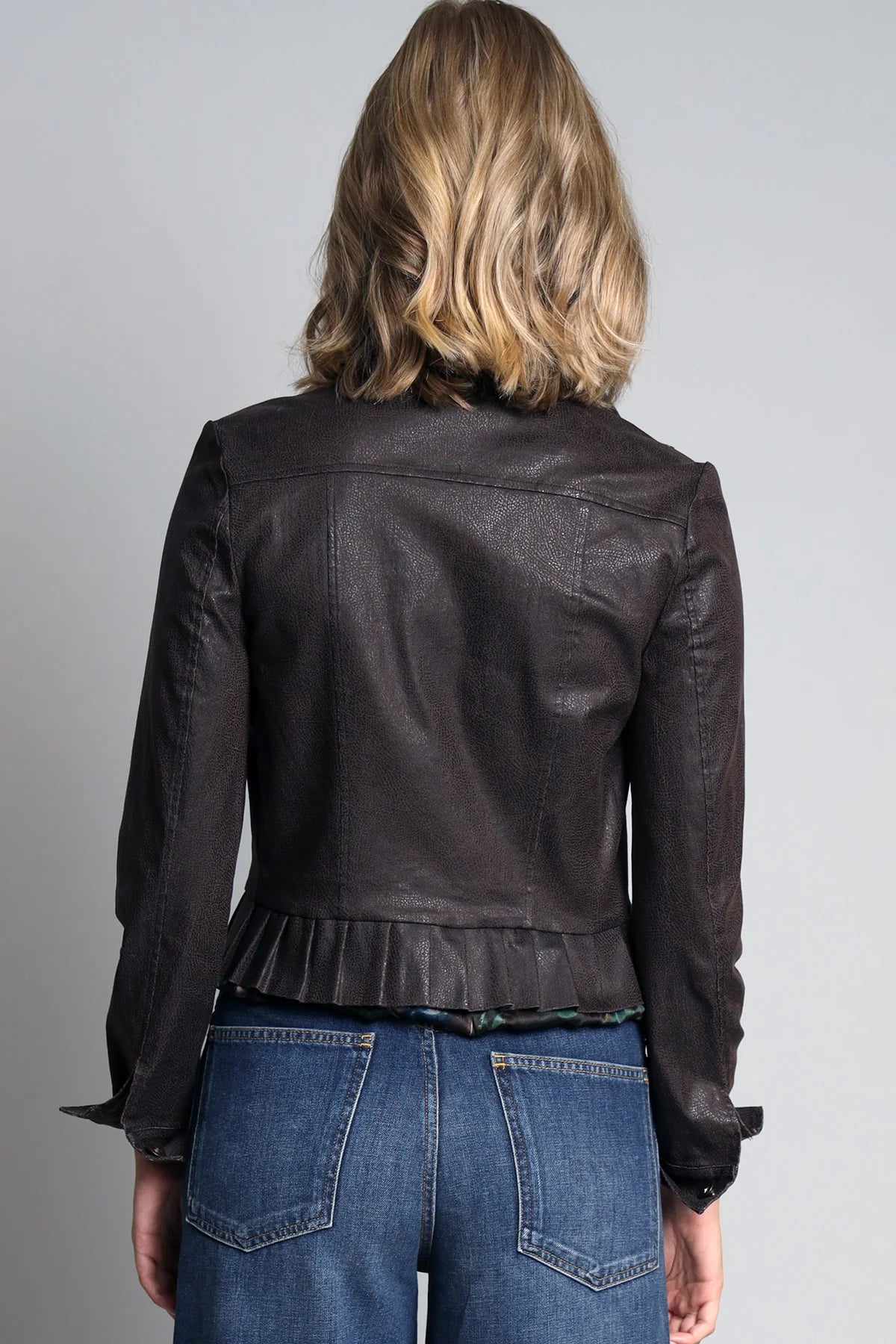 Make a bold fashion statement with the Lola + Sophie Foil Denim Jacket. This elevated take on a classic staple combines timeless denim comfort with eye-catching metallic foil detailing and a distinctive pleated ruffle hem. Versatile enough to pair with anything in your closet, it transitions seamlessly from casual to dressed-up occasions. The perfect piece for those who refuse to blend in.