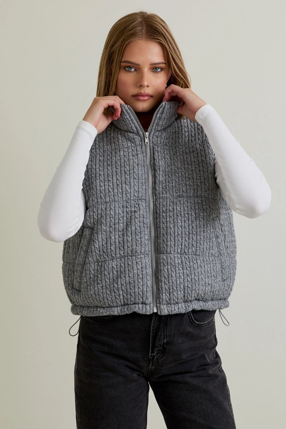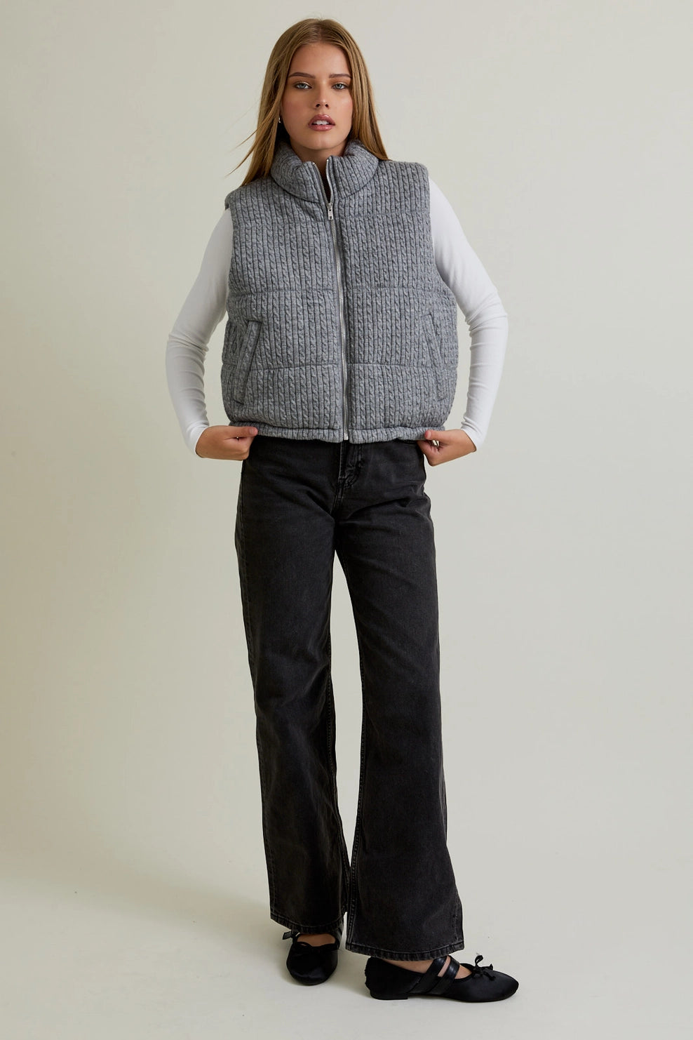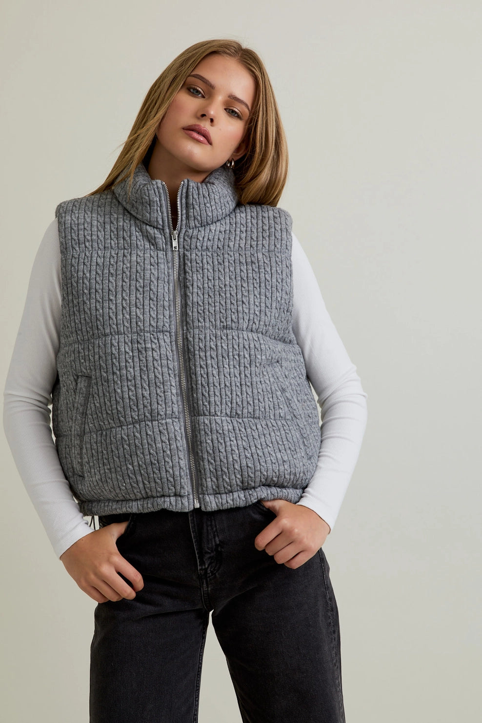 Stay warm and stylish with the 61 Jane Knit Puffer Vest. Featuring a zippered front and convenient pockets, this vest combines practical warmth with easy access for essentials. Its knit fabric adds a cozy texture that complements any outfit, making it the perfect layering piece for cooler days. Elevate your outerwear with this versatile vest designed for comfort and functionality.