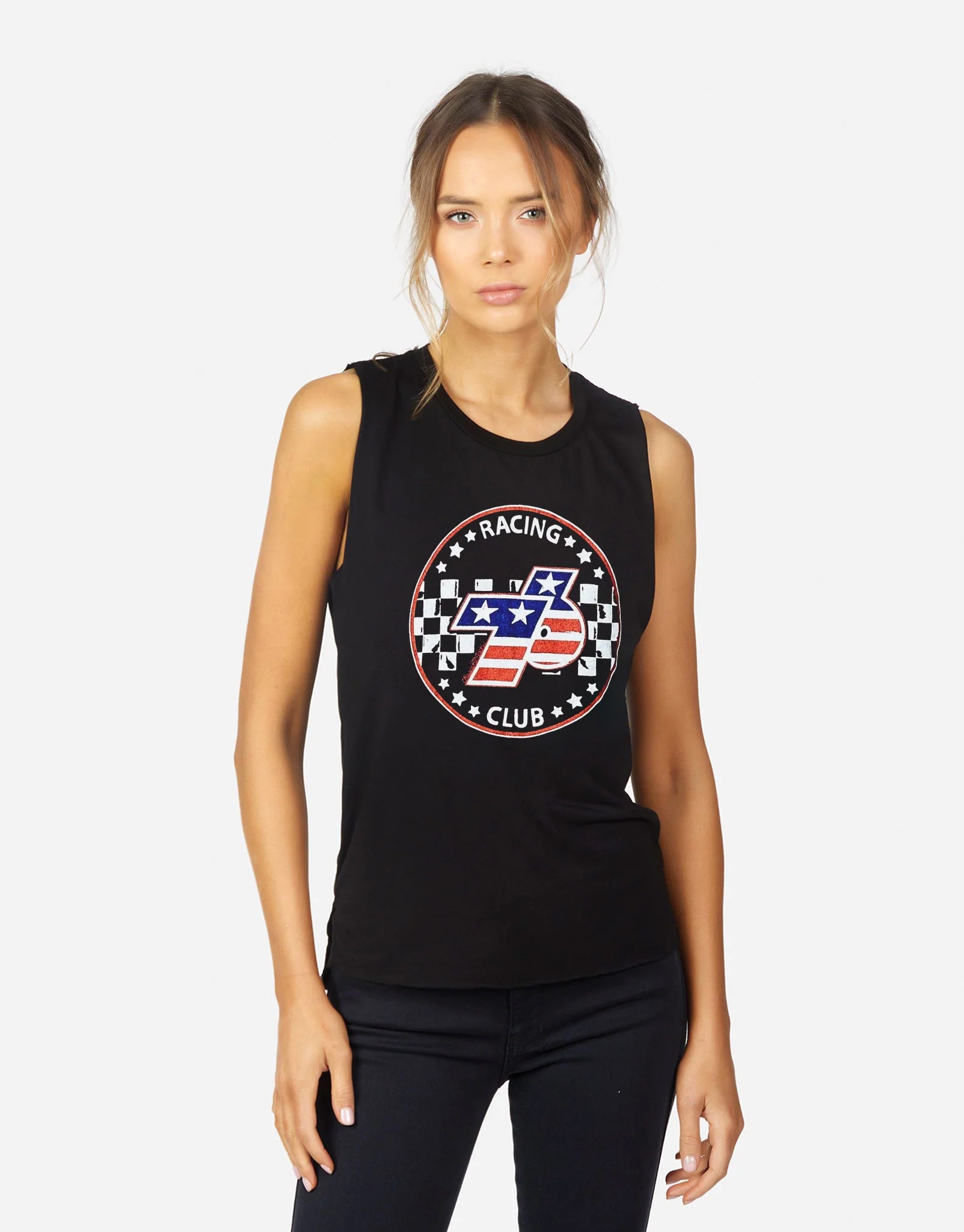 Experience the ultimate comfort of our Lauren Moshi Kinzington Racing Club Tank, crafted from ultra-soft jersey fabric that feels luxurious against your skin. The raw cut arm openings and hem deliver an effortlessly edgy aesthetic, while the bold front screen print graphic featuring "76" and a checkered flag adds authentic racing-inspired style. Perfect for casual wear or layering, this tank combines premium comfort with eye-catching design that makes a statement.