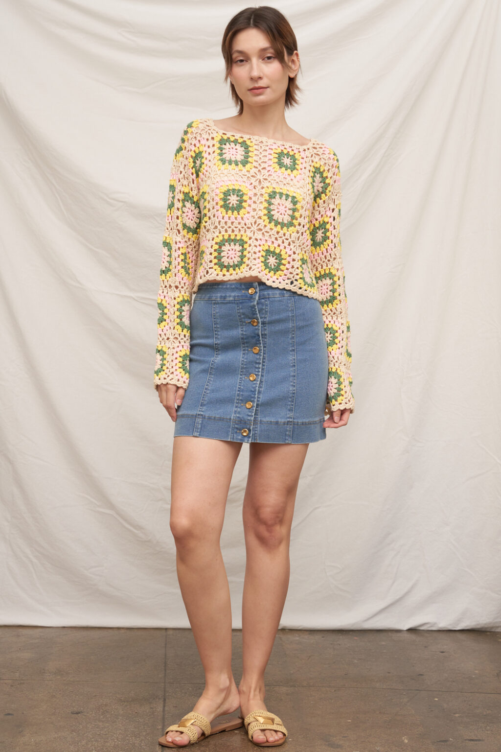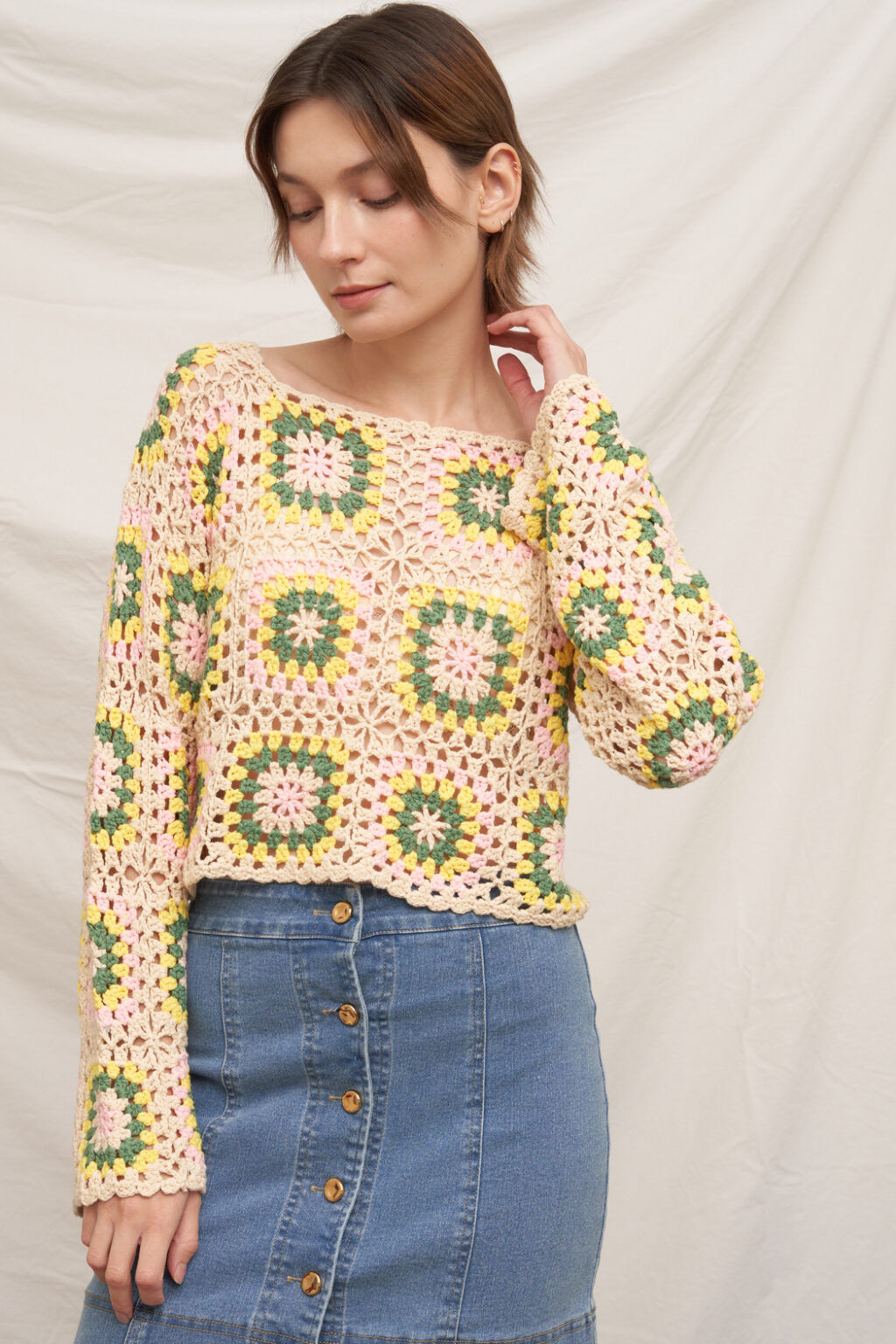 Handcrafted charm meets modern style with this cropped long-sleeve crochet top. Featuring classic granny square motifs in a timeless design, this piece layers beautifully over basics or stands alone as a statement piece. The relaxed fit and breathable crochet construction offer comfort without compromise, while the cropped silhouette flatters any frame. Perfect for casual outings, festival vibes, or adding vintage-inspired texture to your everyday wardrobe. A versatile essential that celebrates artisanal craftsmanship.