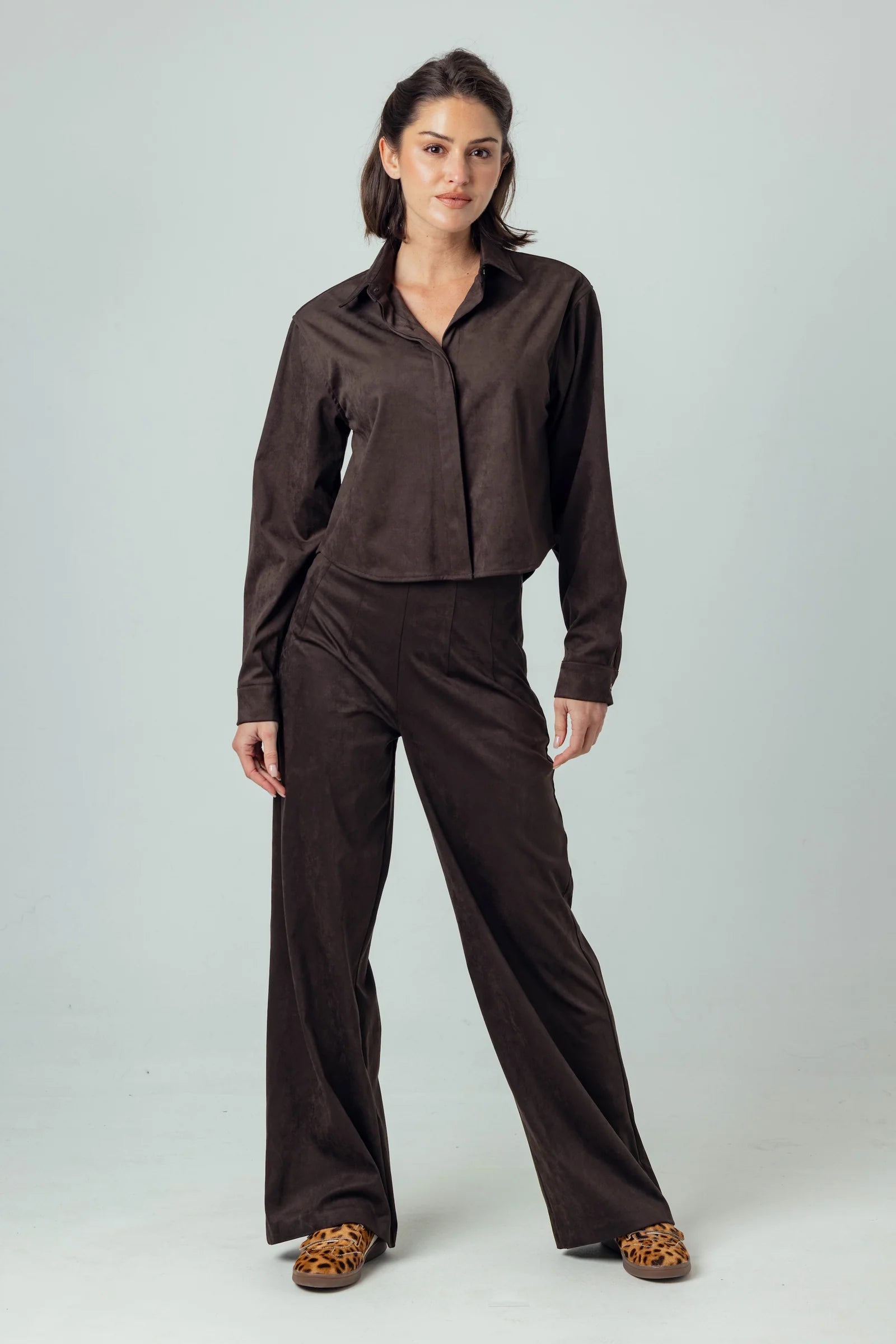 The Sundays Ozian Shirt reinvents the classic button-up with a modern twist. Crafted from luxurious espresso faux suede, it offers a slightly oversized, cropped fit that blends structure with comfort. Featuring a clean covered placket, crisp collar, button cuffs, and rounded hems, this shirt elevates your everyday look with effortless style and subtle sophistication. Perfect for those who appreciate polished details and relaxed elegance in one versatile piece.