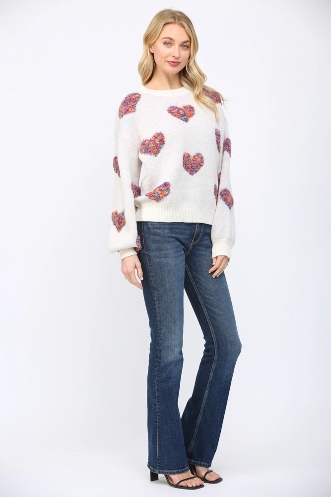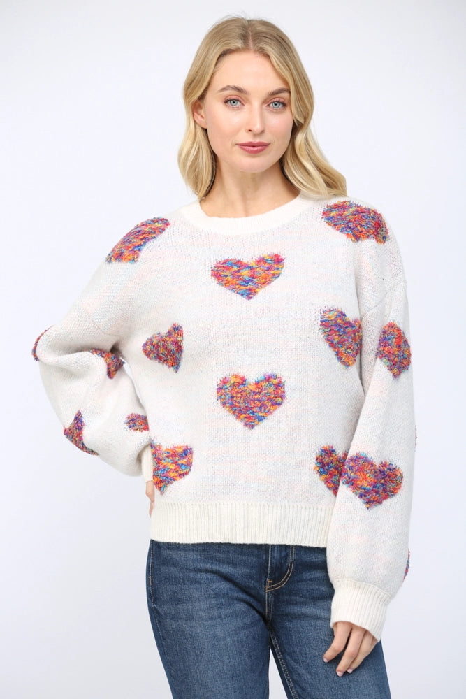 Elevate your everyday style with this charming American Poet Heart Sweater, featuring an eye-catching multicolor textured heart pattern set against a crisp white base. The signature balloon sleeves add a playful, romantic touch that instantly transforms any outfit from ordinary to unforgettable. Perfect for layering or wearing solo, this versatile piece brings warmth and personality to your wardrobe. Whether you're dressing up for a special occasion or keeping it casual, this sweater delivers comfort without compromising on style. A must-have for anyone who loves bold, expressive fashion.